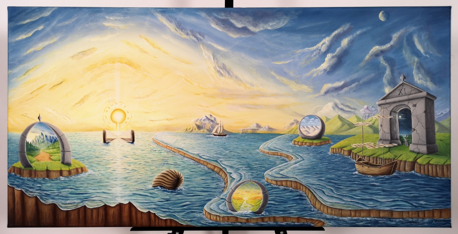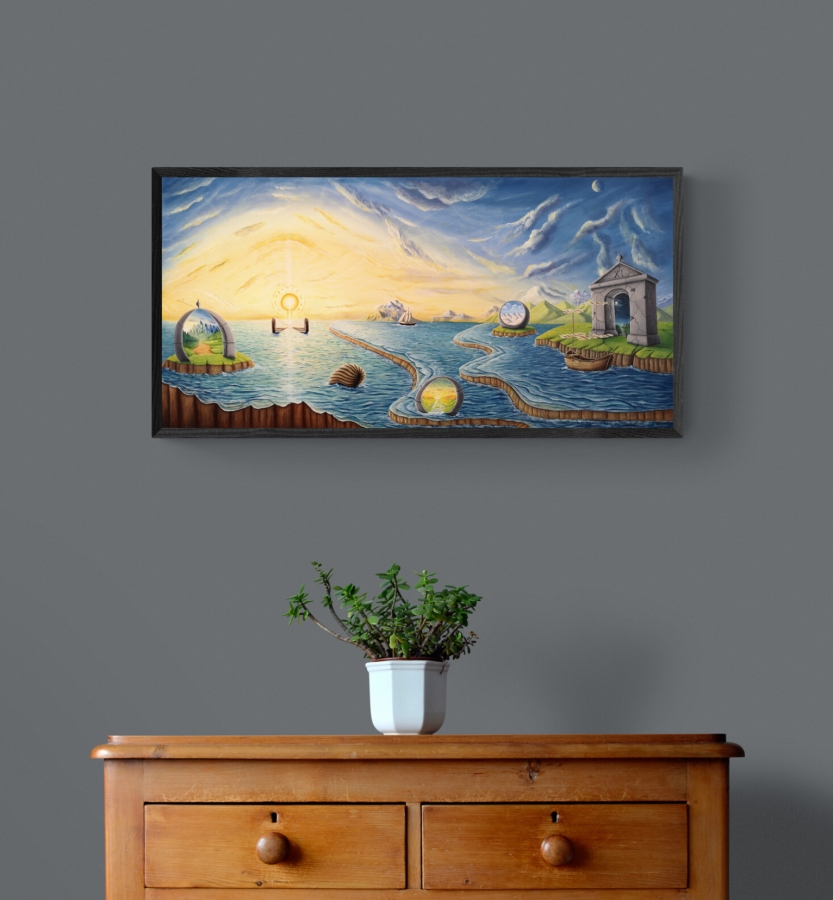 Obraz akrylowy na płótnie bawełnianym, malarstwo surrealistyczne. Praca sygnowana: z przodu - podpis artysty „Asensir”, z tyłu – tytuł / podpis, imię i nazwisko artysty / rok powstania. Praca nie zawiera ramy, boczne krawędzie płótna zamalowane estetycznie na czarno - obraz gotowy do powieszenia. Wymiary: 50x100x2cm. Obrazy artysty są spojrzeniem w świat snów. W pracach z cyklu „Time” zgłębia on naturę czasu - jego złożoność, iluzoryczność i wpływ na nasze decyzje oraz sposób postrzegania rzeczywistości. Kompozycje, portale i motyw szachów tworzą spójny system symboli - metaforę wyborów, przemijania i nieustannej gry między tym, co kontrolowane, a tym, co wymyka się przewidywaniom. „Time” to opowieść o naszych ruchach w ponadczasowej rozgrywce - próba uchwycenia jednocześnie ulotności i trwałości doświadczeń. To świat, w którym czas przestaje być prostą linią i zamienia się w labirynt - przestrzeń poszukiwania własnej drogi, szans i utraconych momentów. Prace artysty znajdują się w prywatnych kolekcjach w Polsce oraz m.in. w USA, Japonii, RPA, Niemczech, Hiszpanii, Francji, Izraelu.