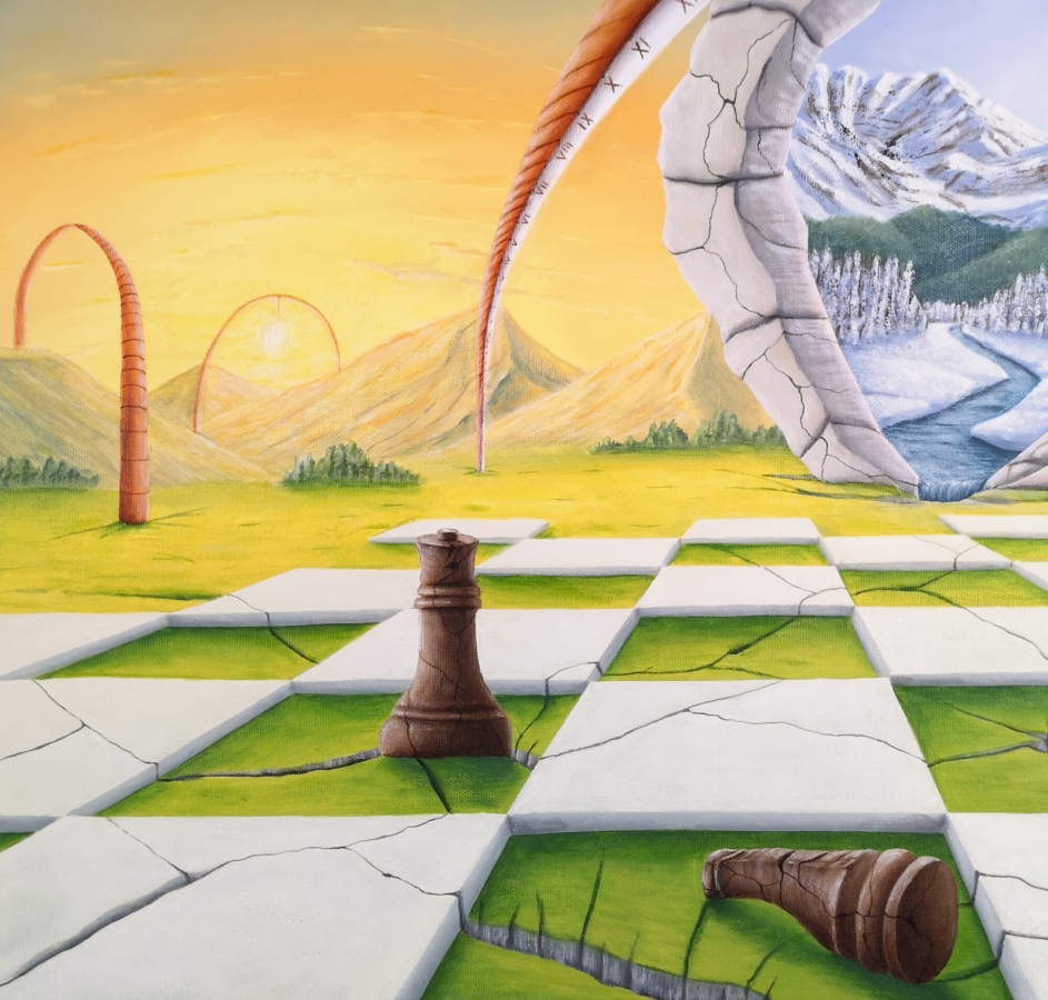 surrealizmfantastykarealizm magicznynadrealizmPejzaż fantastycznypejzażgóryKrajobrazzachód słońcaczasZegarportalportal czasuszachyszachownicapionekzimalatoMalarstwoobrazSztuka Współczesnaakryl