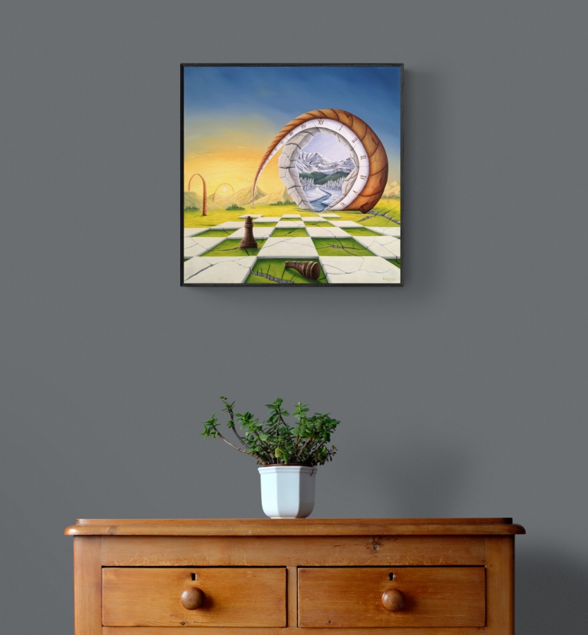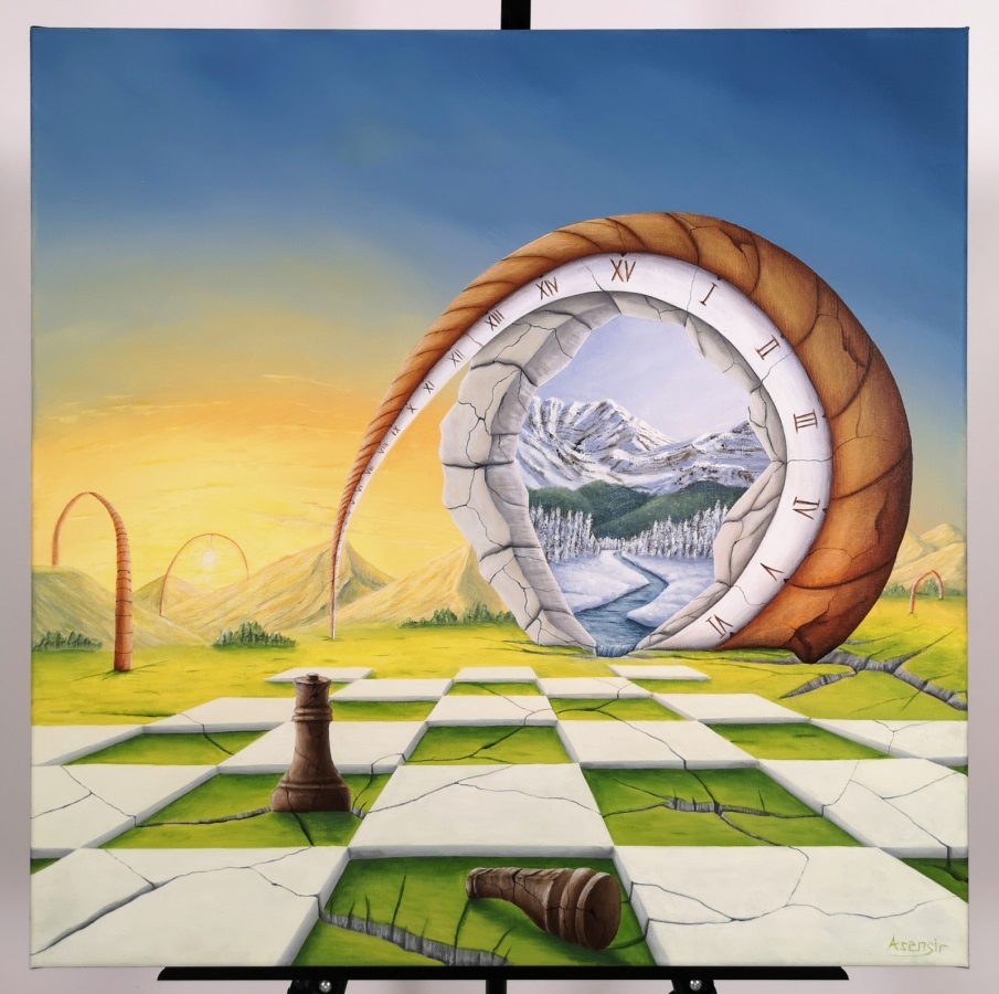 Obraz akrylowy na płótnie bawełnianym, malarstwo surrealistyczne. Praca sygnowana: z przodu - podpis artysty „Asensir”, z tyłu – tytuł / podpis, imię i nazwisko artysty / rok powstania. Praca nie zawiera ramy, boczne krawędzie płótna zamalowane estetycznie na czarno - obraz gotowy do powieszenia. Wymiary: 60x60x2cm. Obrazy artysty są spojrzeniem w świat snów. W pracach z cyklu „Time” zgłębia on naturę czasu - jego złożoność, iluzoryczność i wpływ na nasze decyzje oraz sposób postrzegania rzeczywistości. Kompozycje, portale i motyw szachów tworzą spójny system symboli - metaforę wyborów, przemijania i nieustannej gry między tym, co kontrolowane, a tym, co wymyka się przewidywaniom. „Time” to opowieść o naszych ruchach w ponadczasowej rozgrywce - próba uchwycenia jednocześnie ulotności i trwałości doświadczeń. To świat, w którym czas przestaje być prostą linią i zamienia się w labirynt - przestrzeń poszukiwania własnej drogi, szans i utraconych momentów. Prace artysty znajdują się w prywatnych kolekcjach w Polsce oraz m.in. w USA, Japonii, RPA, Niemczech, Hiszpanii, Francji, Izraelu.