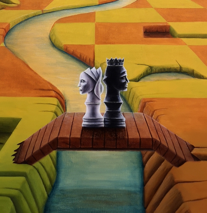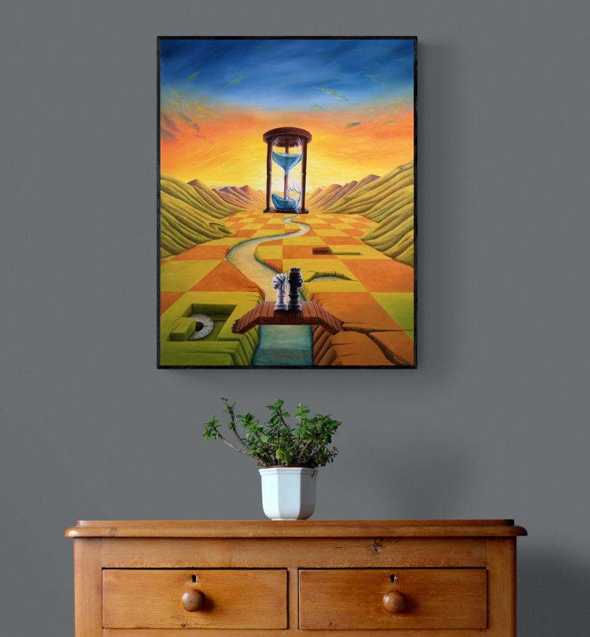 Obraz akrylowy na płótnie bawełnianym, malarstwo surrealistyczne. Praca sygnowana: z przodu - podpis artysty „Asensir”, z tyłu – tytuł / podpis, imię i nazwisko artysty / rok powstania. Praca nie zawiera ramy, boczne krawędzie płótna zamalowane estetycznie na czarno - obraz gotowy do powieszenia. Wymiary: 90x70x2cm. Obrazy artysty są spojrzeniem w świat snów. W pracach z cyklu „Time” zgłębia on naturę czasu - jego złożoność, iluzoryczność i wpływ na nasze decyzje oraz sposób postrzegania rzeczywistości. Kompozycje, portale i motyw szachów tworzą spójny system symboli - metaforę wyborów, przemijania i nieustannej gry między tym, co kontrolowane, a tym, co wymyka się przewidywaniom. „Time” to opowieść o naszych ruchach w ponadczasowej rozgrywce - próba uchwycenia jednocześnie ulotności i trwałości doświadczeń. To świat, w którym czas przestaje być prostą linią i zamienia się w labirynt - przestrzeń poszukiwania własnej drogi, szans i utraconych momentów. Prace artysty znajdują się w prywatnych kolekcjach w Polsce oraz m.in. w USA, Japonii, RPA, Niemczech, Hiszpanii, Francji, Izraelu.