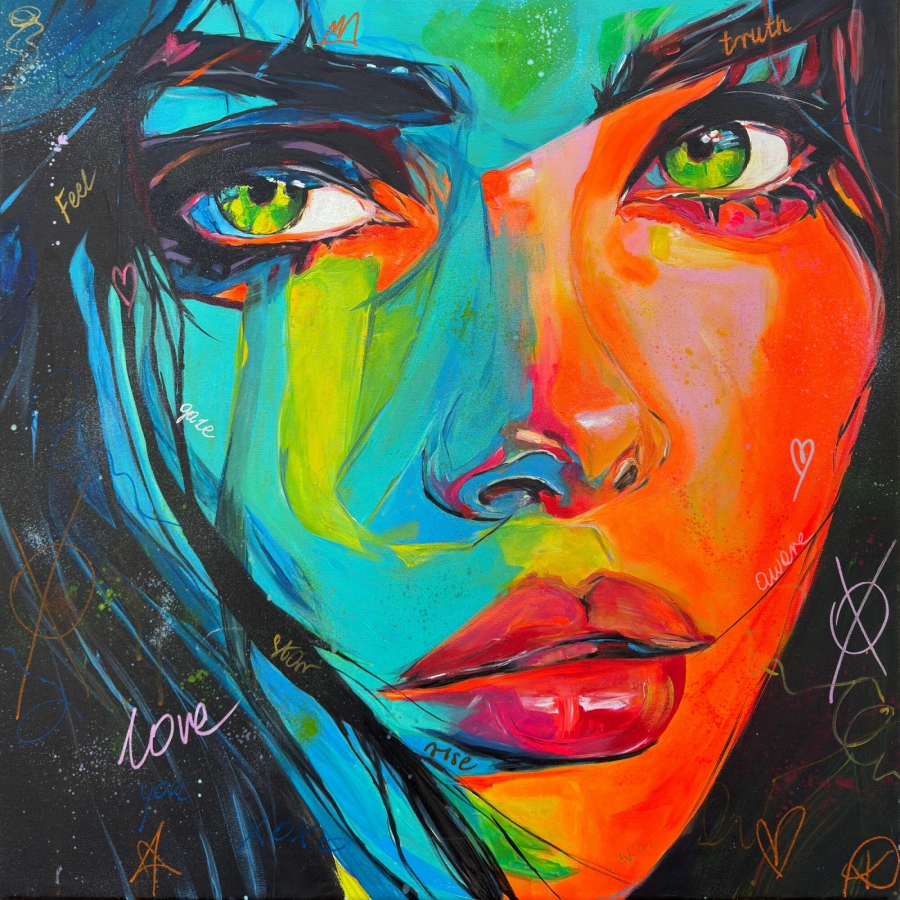 „Truth” to współczesny obraz figuratywny, który koncentruje się na emocjach ukrytych pod powierzchnią spojrzenia. Inspiracją do jego powstania była potrzeba uchwycenia momentu wewnętrznej konfrontacji - chwili, w której prawda przestaje być myślą, a staje się odczuciem. Przedstawiona twarz nie jest klasycznym portretem, lecz nośnikiem energii i stanu emocjonalnego, który widz może interpretować na własny sposób. Kompozycja opiera się na kontraście chłodnych i ciepłych barw. Intensywne turkusy i błękity zestawione zostały z wyrazistymi pomarańczami i czerwieniami, tworząc napięcie pomiędzy spokojem a ekspresją. Charakterystyczne detale, znaki i słowa wkomponowane w strukturę obrazu pełnią funkcję symboli, nadając pracy dodatkową warstwę znaczeniową i zachęcając do uważnego odbioru. Obraz został wykonany w technice mieszanej na płótnie, z użyciem farb akrylowych oraz markerów akrylowych. Praca najlepiej zaprezentuje się we wnętrzach nowoczesnych, loftowych lub minimalistycznych, gdzie może pełnić rolę wyrazistego akcentu wizualnego i emocjonalnego.