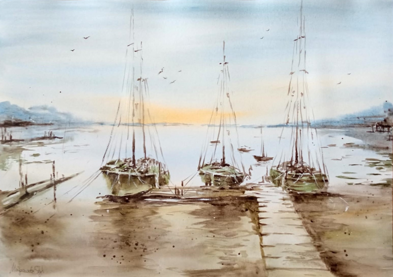 Akwarela na papierze bawełnianym. Oprawa we własnym zakresie, obraz sprzedawany bez ramy. Praca zabezpieczona werniksem do akwareli, chroniącym przed kurzem i wilgocią.