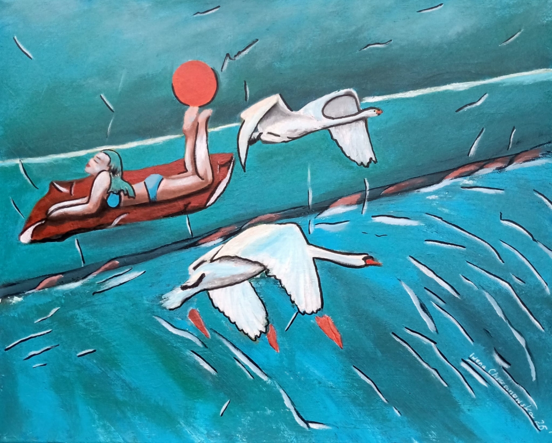Spokojny, wyciszający widok leżącej na kocu nad rzeką dziewczyny w kostiumie i łabędzi w locie. Nieco uproszczona, niemal graficzna forma przekazu, że wszystko jest możliwe, nawet słońce, które przysiadło na stopie kobiety. Miły, lekki i przyjemny widok w tonacji turkusu. Obraz namalowany farbami akrylowymi, ma zamontowaną zawieszkę.