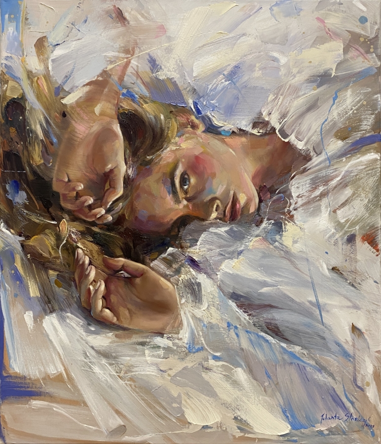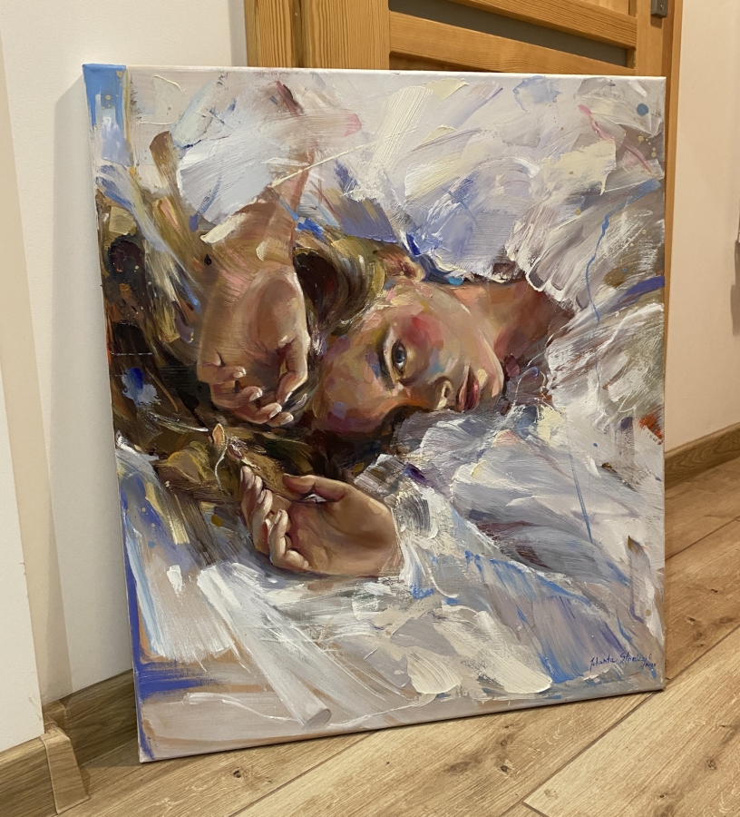 Obraz przedstawia kobietę leżącą w białej, miękkiej pościeli, ukazaną z perspektywy widza patrzącego z góry. Jej ciało ułożone jest swobodnie, jak w chwili tuż przed zaśnięciem, kiedy napięcie dnia ustępuje cichej, intymnej ciszy. Kobieta spogląda prosto w stronę obserwującego. Biel pościeli otula ją niczym świetlista aura, podkreślając kruchość i subtelność momentu. Dominują miękkie, stonowane odcienie, które budują atmosferę wyciszenia oraz wewnętrznego spokoju • Obraz malowany farbami olejnymi na płótnie bawełnianym o wymiarze 80x60cm rok wykonania 2025. • Zabezpieczony werniksem, który nasyca kolory oraz chroni farbę na lat. • Boki i krawędzie są pomalowane na kolor czarny co estetycznie zamyka całość obrazu. •Sygnowany z przodu i tyłu obrazu. • Gotowy do powieszenia – wyposażony w zamocowaną zawieszkę umożliwiający bezpieczny montaż. • Obraz przed wysyłką zabezpieczony w sztywny karton oraz folię. • Do obrazu wystawiam fakturę, bądź paragon.