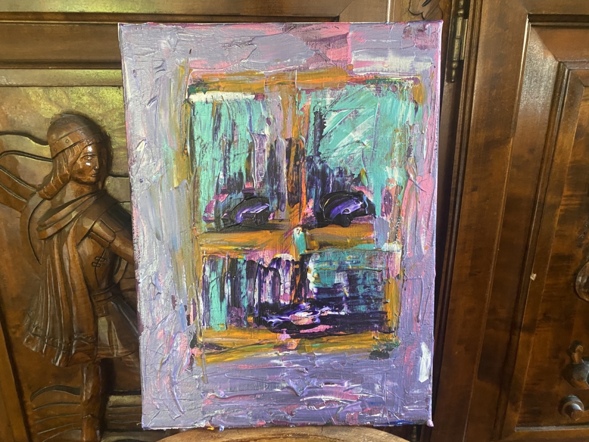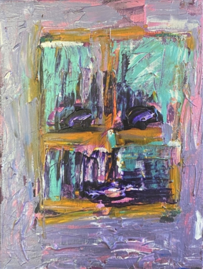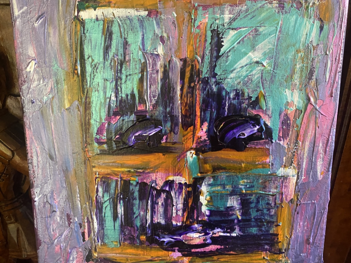 Liliowe tło i złoty „kadr” otwierają okno na wewnętrzny portret. Turkusy spływają pionami, a fioletowe akcenty układają się w oczy i uśmiech, który raz znika, raz wraca. Gęsta olejna faktura trzyma uwagę jak szept. Obraz wnosi do wnętrza tajemnicę i miękkie światło, które zmienia się w ciągu dnia.