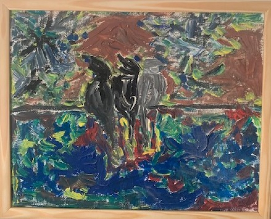 Obraz zatytułowany „Ukochane ptaki "przedstawia trzy ptaki siedzące na drucie. Dwa z nich to kruki, a jeden to gołąb. Siedzą blisko siebie na cienkim drucie nad ciemną wodą. Tło jest głębokie i ciemne, co tworzy tajemniczą atmosferę. Woda poniżej jest również ciemna i lekko odbijająca światło. Ptaki są namalowane widocznymi pociągnięciami pędzla i silnymi kontrastami. Obraz został wykonany techniką malarstwa olejnego. Ogólny nastrój dzieła jest spokojny, cichy i nieco melancholijny.