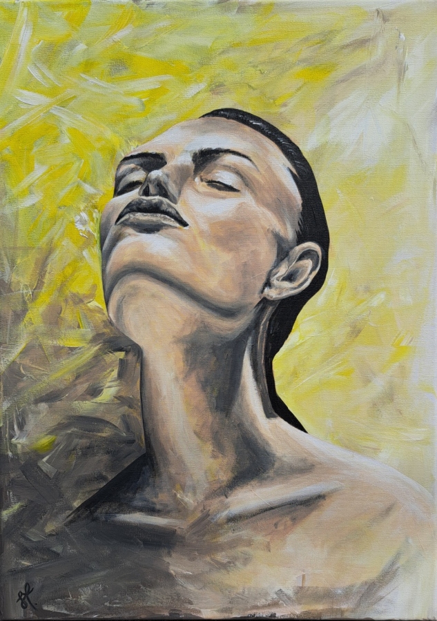 "Ukojenie" należy do serii EMOCJE Jest to obraz o spełnieniu. Świetlisty, słoneczny, kobieta zwrócona w stronę słońca, jakby ono należało tylko do niej. Jest to akryl na płótnie w rozmiarze 70×50. Obraz jest częścią serii Emocje, która była wystawiana w RCKK w Myszyńcu oraz obecnie jest wystawiana w Bibliotece Publicznej w Warszawie 09.03-03.04. Po wystawie wysyłam wraz z Certyfikatem autentyczności