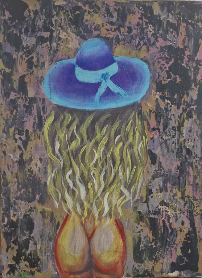 Obraz przedstawia kobiecą postać, której tożsamość pozostaje ukryta. Duży kapelusz zasłania twarz, sugerując intymność i ochronę. Ciało przenika organiczna struktura przypominająca trawy lub płomienie — symbol wewnętrznej energii, która wyrasta z głębi. Kontrast chłodnego błękitu i ciepłych tonów ciała podkreśla napięcie między spokojem a wewnętrznym żarem. Obraz na płótnie wykonany farbą akrylową.