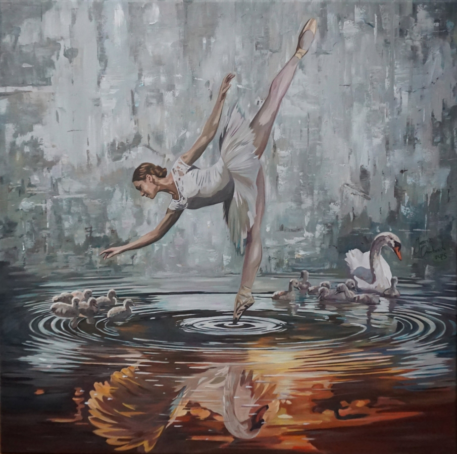 Ekspresyjny obraz olejny w technice mieszanej na płótnie bawełnianym z cyklu: W odbiciu wody. Praca nie wymaga ramy, boczne krawędzie płótna zamalowane. Obraz posiada dodatkową fakturę uzyskaną techniką szpachli. Praca zawerniksowana satynowym werniksem. Obraz jest sygnowany z tyłu i z przodu monogramem artysty/Janusz Orzechowski 2025. Obraz jest częścią otwartego cyklu malarskiego, rozpoczętego w 2014 roku pt: W odbiciu wody. Cykl przedstawia postaci kobiece w odbiciach wody. Praca może rozjaśnić wnętrze salonu, sypialni jak również gabinetu. Obraz może stać się miłym prezentem dla miłośników muzyki, osób ceniących minimalizm oraz nowoczesną geometrię.