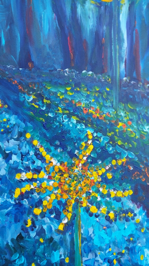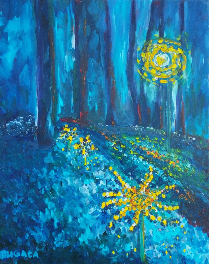 Kompozycja utrzymana w intensywnych błękitach, przełamanych ciepłym, pulsującym światłem w górnej części obrazu. Jasny rozbłysk wprowadza element tajemnicy. Dolną partię wypełniają drobne, migoczące punkty, które nadają całości rytm i subtelną dynamikę. Obraz łączy intuicyjną abstrakcję z impresyjną obserwacją światła, tworząc atmosferę spokoju, skupienia i lekkiej oniryczności. Dzieło doskonale odnajduje się w nowoczesnych wnętrzach, przestrzeniach relaksacyjnych i kolekcjach sztuki współczesnej, w których liczy się nastrój i gra światła