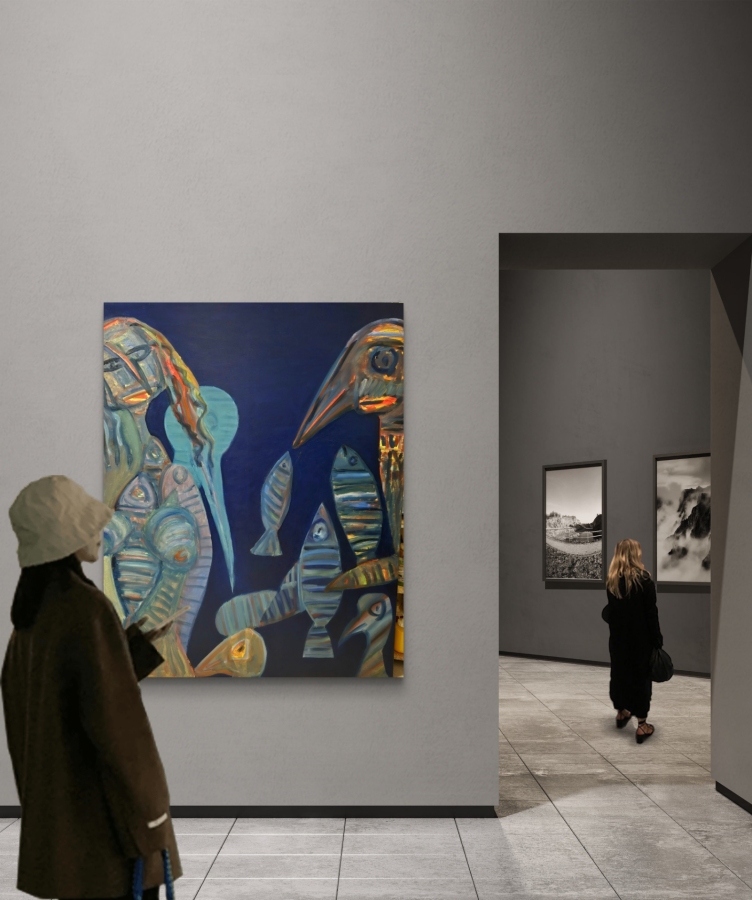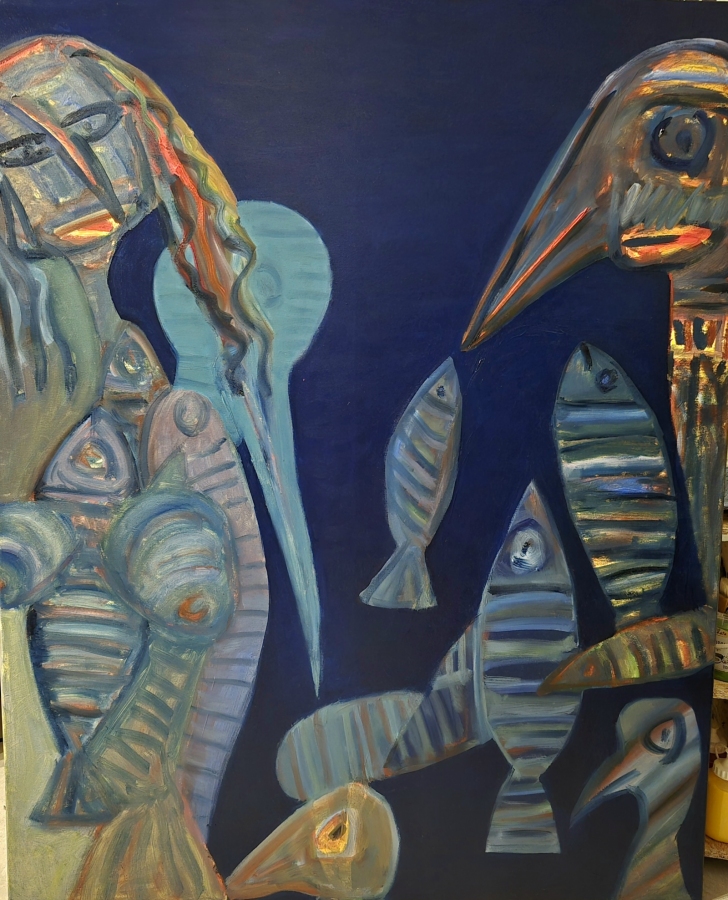 Obraz olejny na płótnie z cyklu WĘDROWCY, wymiar 150 x 120 cm. WĘDROWCY to aktualnie najważniejszy, najnowszy cykl Kazimierza Klickiego — przede wszystkim duże obrazy na płótnie, często w formacie 150 × 120 cm, a także mniejsze prace. To malarskie spotkania z człowiekiem, naturą, pamięcią i tym, co nie do końca nazwane. W tym malarstwie ważny jest gest i sam akt malowania. Istotna jest relacja z podświadomością i stan "tu i teraz" autora. Każdy obraz to kolejny etap drogi, prowadzącej między rytmem, ciszą, strukturą i gestem.