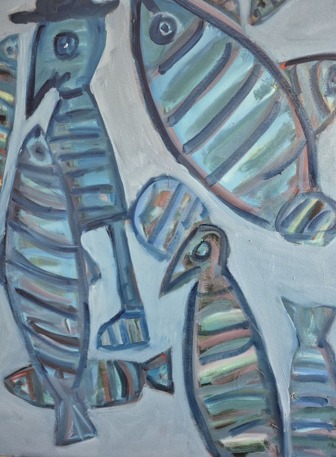 Obraz olejny na płótnie z cyklu WĘDROWCY, format 75 x 55 cm. WĘDROWCY to aktualnie najważniejszy, najnowszy cykl Kazimierz Klickiego — przede wszystkim duże obrazy na płótnie, najczęściej w formacie 150 × 120 cm, oraz formaty śrdniej wielkości i mniejsze. To malarskie spotkania z człowiekiem, naturą, pamięcią i tym, co nie do końca nazwane. Każdy z obrazów z tego cyklu, to moment zatrzymania się artysty i doświadczenie kontaktu ze sobą samym i ze Światem. Między rytmem, ciszą, strukturą i gestem. Wyraz wolności kreacji.
