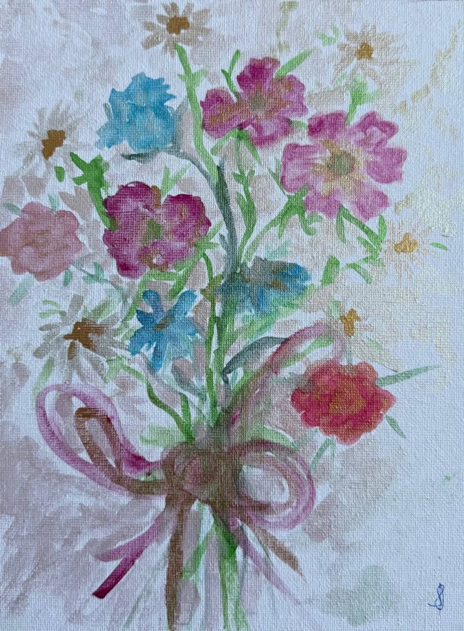 Obraz zatytułowany „Wesołe kwiaty” przedstawia jasny i kolorowy ogród pełen kwitnących kwiatów. W centrum obrazu znajdują się duże kwiaty o uśmiechniętych twarzach i żywych płatkach. Kolory są bardzo żywe, w tym odcienie żółci, różu, błękitu i czerwieni. Kwiaty zdają się delikatnie tańczyć w ciepłym słońcu. Niebo w tle jest czyste i jasnoniebieskie, co sprawia, że scena wygląda spokojnie i radośnie. Zielona trawa i małe motyle dodają obrazowi uroku i ruchu. Obraz tworzy radosny i pozytywny nastrój, który sprawia, że odbiorca czuje się szczęśliwy, radosny.