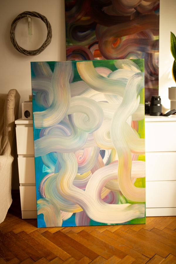 Akryl, na płótnie, 120/80cm, sygnowany na odwrocie, rok powstania 2025. Obraz Dominika Smolika to ekspresyjna, intensywna kompozycja abstrakcyjna, w której kolor i gest budują emocjonalne napięcie. Artysta pracuje warstwowo, łącząc spontaniczny ruch pędzla z bardziej kontrolowanymi strukturami. Dzięki temu obraz żyje – pulsuje energią, ale jednocześnie zachowuje wyczuwalny porządek. To malarstwo, które działa intuicyjnie na odbiorcę: najpierw przyciąga kolorem, a potem pozwala zauważyć rytm, głębię i ukryte relacje między formami. Praca świetnie sprawdzi się zarówno w nowoczesnych, jak i bardziej eklektycznych wnętrzach, wprowadzając mocny akcent i nadając przestrzeni charakter. Smolik buduje swój język malarski w oparciu o ekspresjonizm, ale z wyraźnym naciskiem na współczesną estetykę – dzięki temu jego prace wpisują się w aktualne trendy międzynarodowego rynku sztuki.