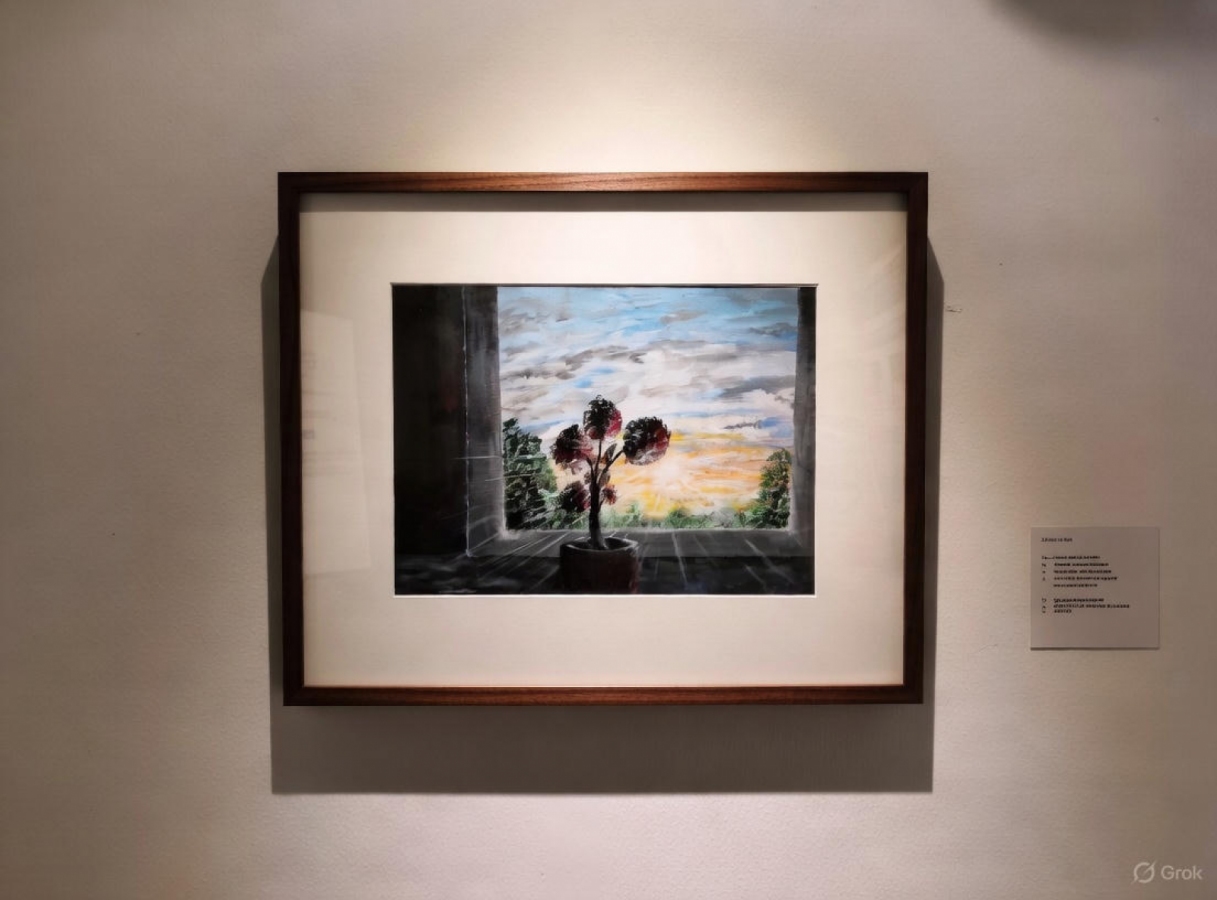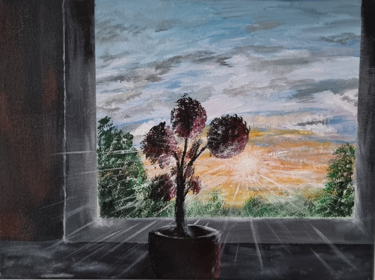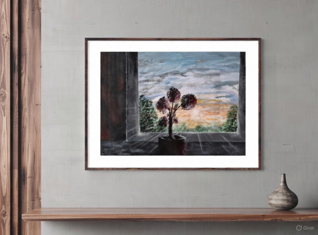 Obraz przedstawia nastrojową, melancholijną kompozycję malarską, w której centralnym motywem jest mała doniczkowa roślina stojąca na parapecie okna. Roślina ma ciemną, niemal czarną doniczkę i gęstą, kulistą koronę w odcieniach głębokiego bordo, fioletu i czerni, co nadaje jej nieco tajemniczy, dramatyczny charakter. Przez szerokie okno widać wschód słońca z zielonymi drzewami po bokach. Wnętrze pomieszczenia jest ciemne i minimalistyczne – widoczne są tylko szare ramy okna i parapet, co podkreśla kontrast między intymnym, zacienionym wnętrzem a otwartym, pełnym światła pejzażem na zewnątrz. Technika malarska jest ekspresyjna, z widoczną fakturą farby i szerokimi, dynamicznymi pociągnięciami pędzla. Paleta barw jest stonowana, z dominacją chłodnych szarości i ciepłych akcentów światła, co potęguje atmosferę refleksji, samotności i kontemplacji natury. Całość dzieła emanuje spokojem, ale też nutą nostalgii i tęsknoty – jakby roślina na parapecie była cichym świadkiem zmieniającego się świata za oknem. To intymny, poetycki obraz, który zaprasza do chwili zadumy. Obrazy w oprawie stanowią wyłącznie wizualizację i propozycję ekspozycji.