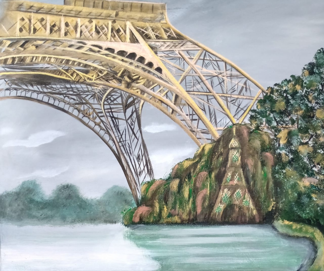 Ostatnio byłam w Paryżu w czasie Igrzysk Olimpijskich i trudno było przy wieży Eiffla znaleźć miejsce na pół człowieka. Jednak znalazłam i się zachwyciłam uroczym zakątkiem wśród zieleni. Tak mniej więcej uchwyciłam kawałek wieży i jej miniaturę wkomponowałam w drzewa. Boki są zamalowane, zamontowana zawieszka.
