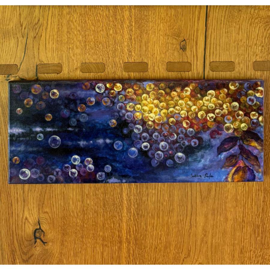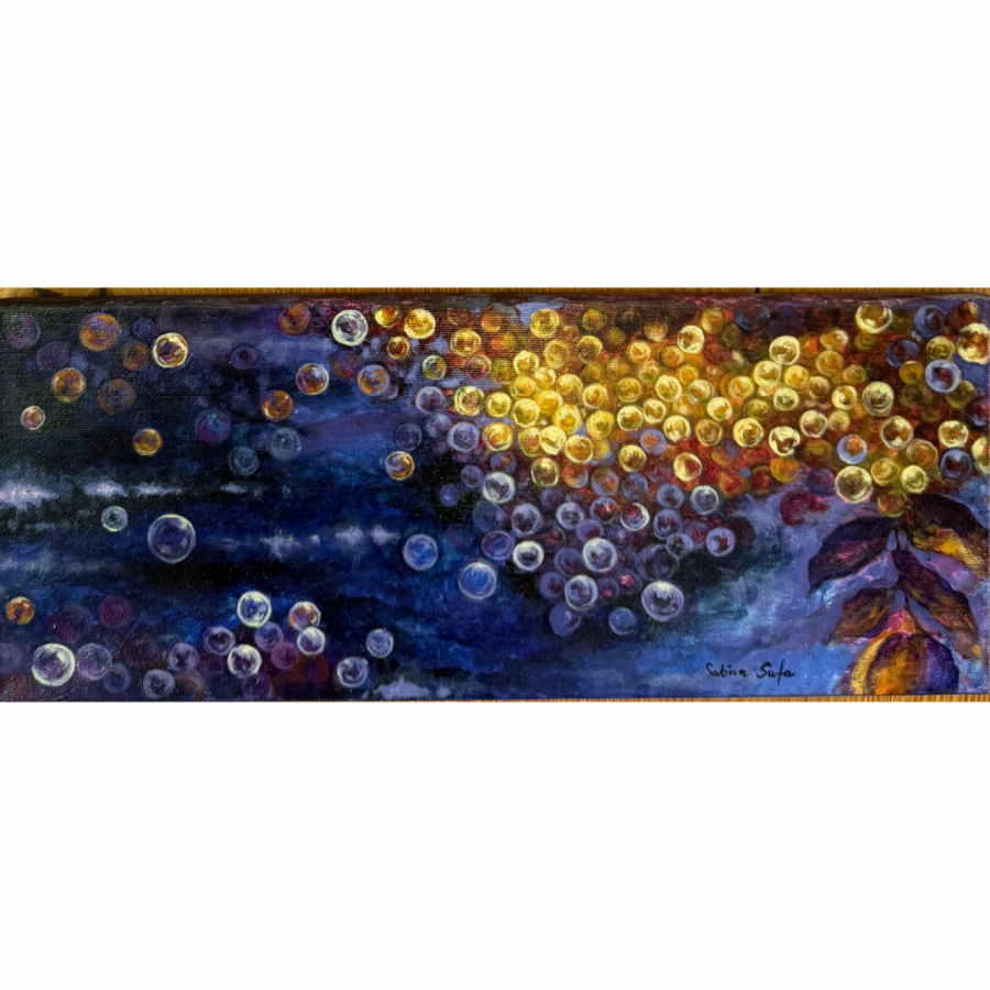Obraz akryl, winnica, winobranie, winogrona. Dopracowany detal, owoce, odbicia i światło. Ciemne tło i ograniczona paleta barw, nadają mu intymny, kontemplacyjny nastrój, skupiający uwagę na formie. Gra światła i cienia