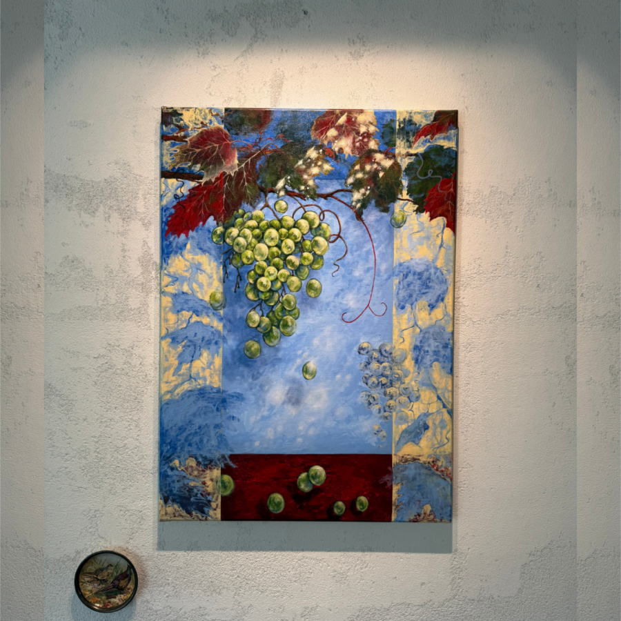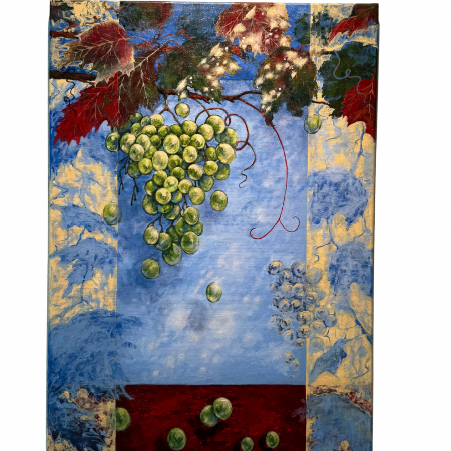 Obraz namalowany akrylem, zabezpieczony werniksem, zbiory winogron, winorośl. Winogrona dojrzewające w świetle, symbol pełni natury i chwili zatrzymanej w czasie.