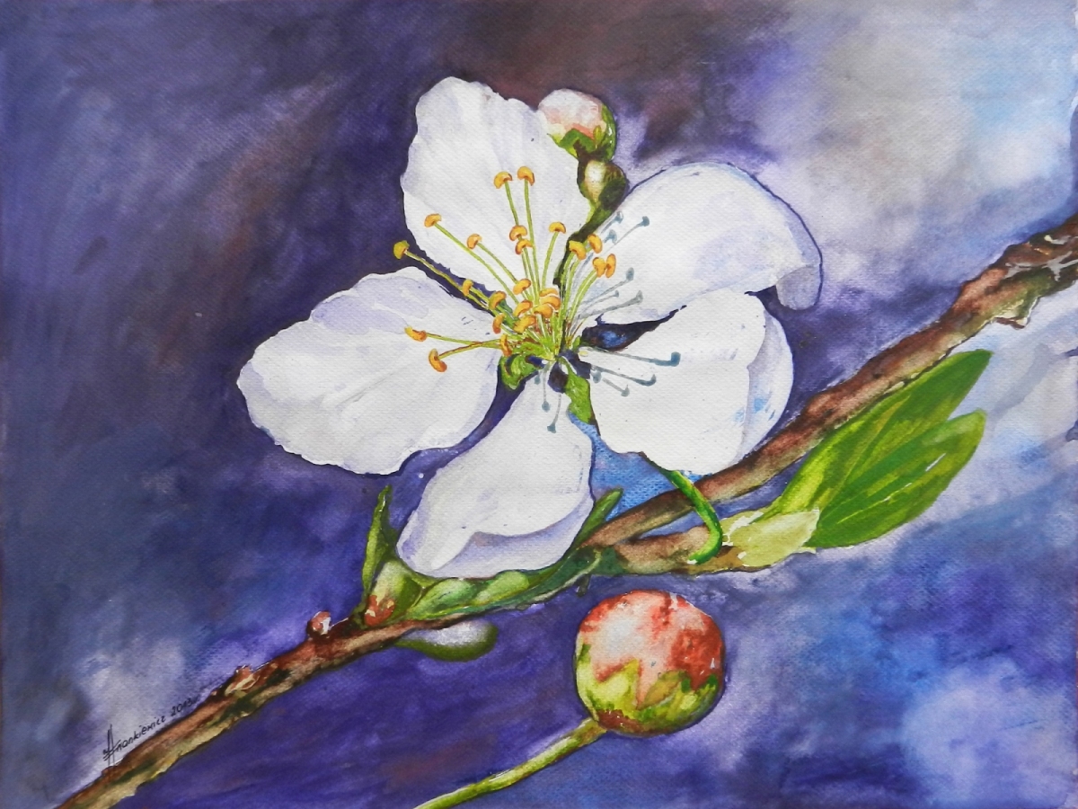 ,, Wiosenne kwiaty ,, to przepełniona błękitem akwarela przedstawiającą rozkwitającą wiosną gałązkę jabłoni .Obraz wykonany tradycyjną techniką akwareli na profesjonalnym , białym papierze artystycznym .. Format 39,7x29,7 cm . Akwarela zabezpieczona werniksem. Praca oryginalna , jedyny egzemplarz opatrzony Autorskim Certyfikatem Autentyczności. Sygnatury autorskie umieszczone z przodu i z tyłu pracy. ,,,,,,,,,,,,,,,,,,,,,,,,,, Art by Jolanta Frankiewicz ,,,,,,,,,,,,,,,,,,,,,,,,,,,,,