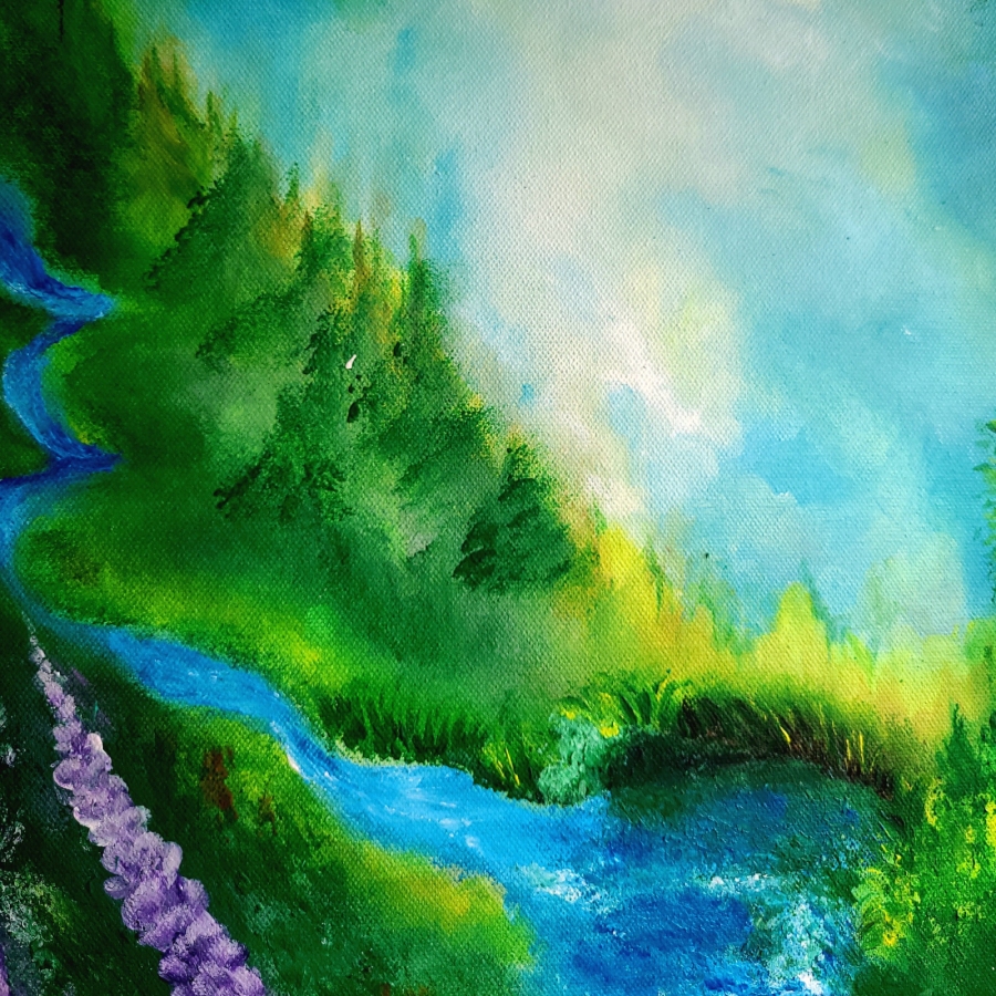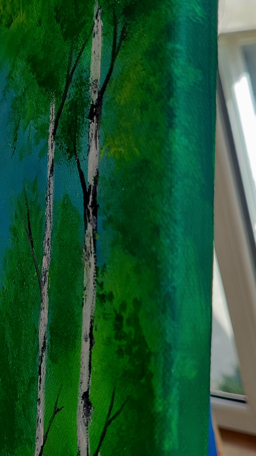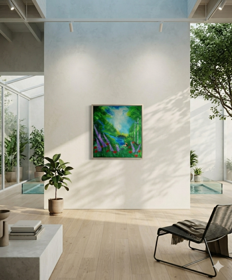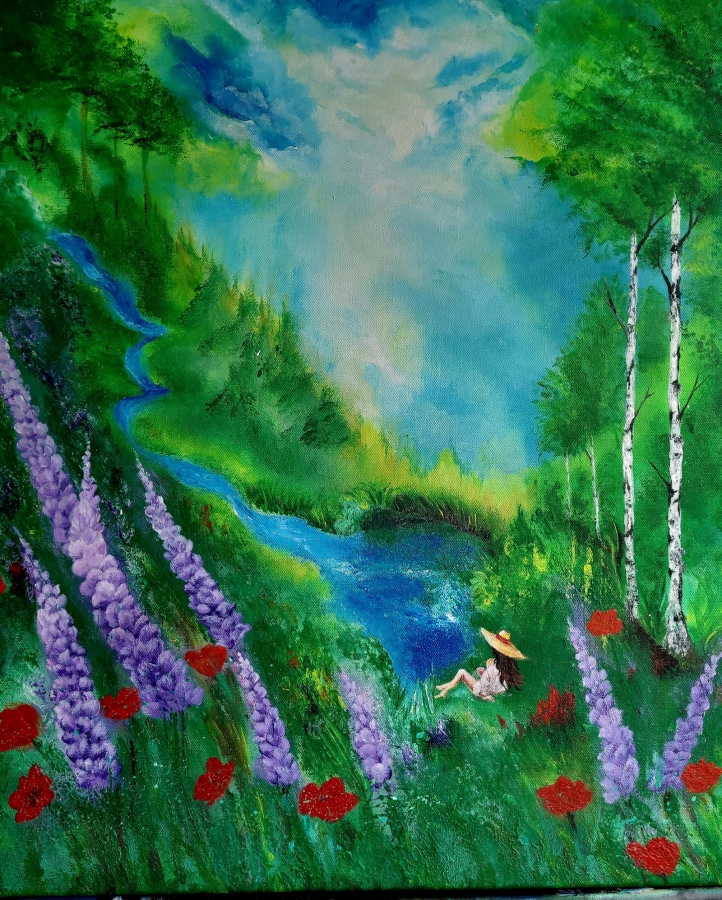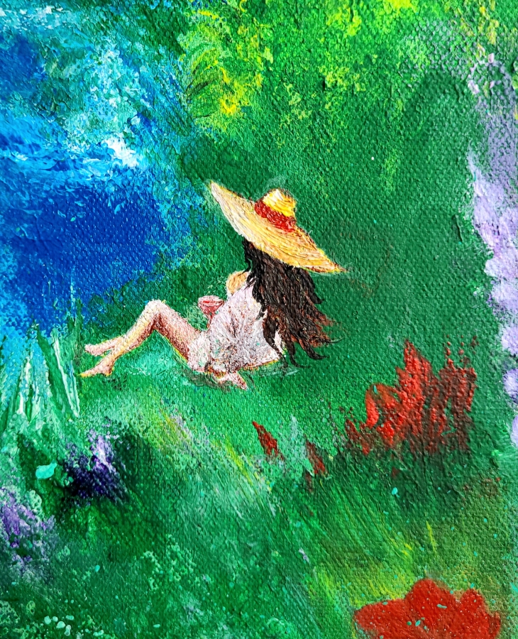 Kompozycja ma w sobie coś z marzenia sennego. Świetlista, niemal niebiańska poświata w górnej części obrazu i postać kobiety w kapeluszu odpoczywającej w tym idealistycznym krajobrazie sprawiają, że scena wydaje się być wyjęta z baśni lub sielankowego wspomnienia.To dzieło, które zdecydowanie ociepla wnętrze i wprowadza do niego spokój.