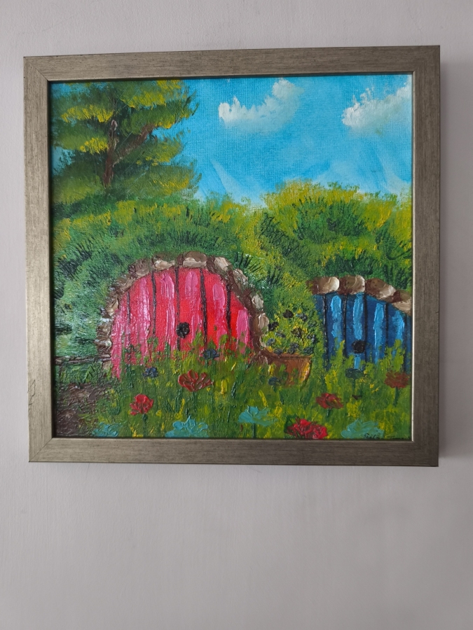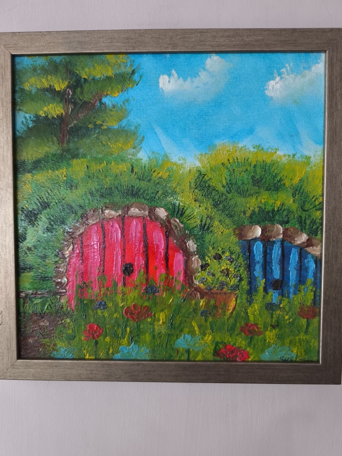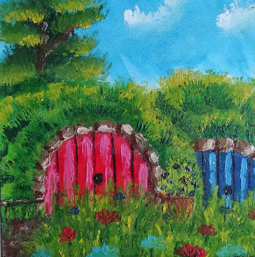 Pejzaż w stylu ilustracji do książek dziecięcych inspirowany książką J.R.R. Tolkiena "Hobbit". Dla osób lubiących intensywne kolory. Może rozjaśnić nawet ponury dzień!