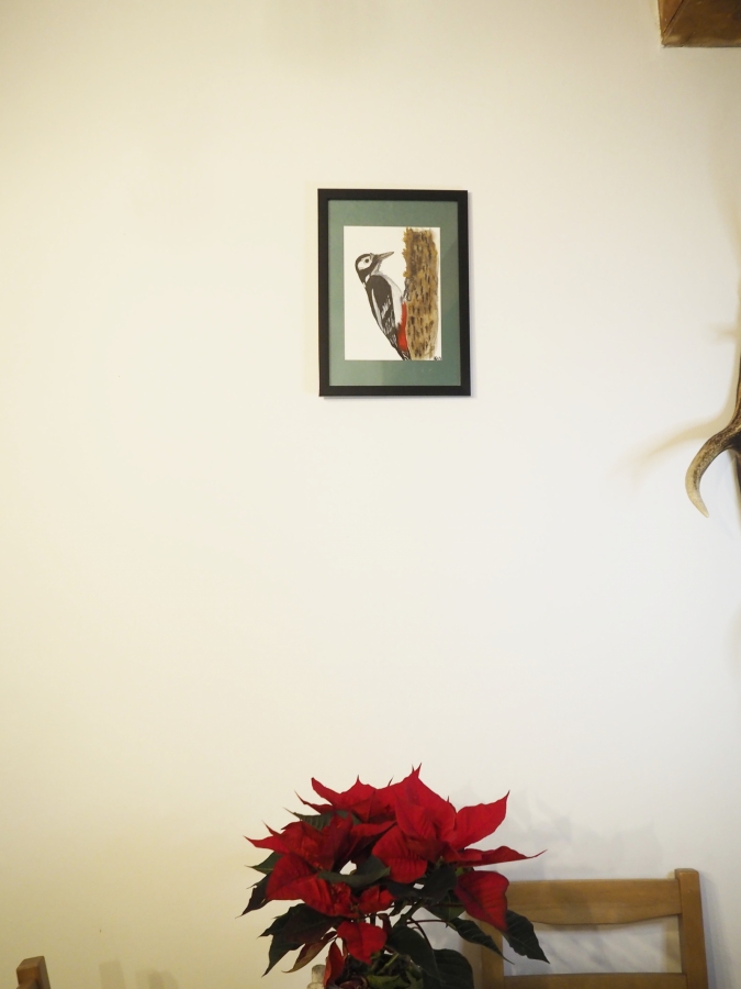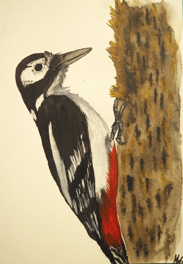 Awkarela 14,5x21,5 przyklejona jest do jedwabnego papieru A4. Inspiracja to mały dzięcioł czerwony, który od lat przylatuje na posesję autorki i uporczywie próbuje wybić dziurę w blasze na kalenicy dachu jej domu. Mały drań, dniami przesiaduje też na sąsiedniej lipie, mile widziany domownik. Obraz jest oprawiony w czarną cienką ramkę do powieszenia lub postawienia. Może byż prezentem dla kogoś, kto lubi ptaki (a może to dla siebie robisz prezent?) W 2023 roku był też bohaterem okładki jednego z czasopism dla rolników, co przypomniało malarce o tym, że warto go namalować. Jest to prosta i zero-jedynkowa praca przedstawiająca ptaka przy pracy, dobrze się prezentuje. To jedna z pierwszych prac Szelki z profesjonalnymi akwarelami.