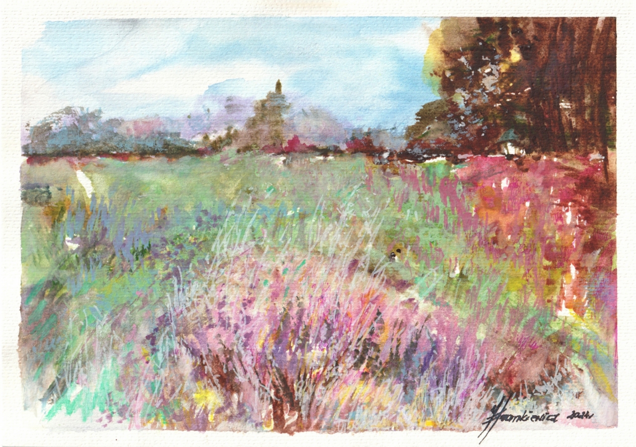 Akwarelapejzażwrzosowa łąkaNieboartystyczny przekazsubtelna ekspresjakolory niebanaturaSztuka Współczesnaobrazna prezentupominek