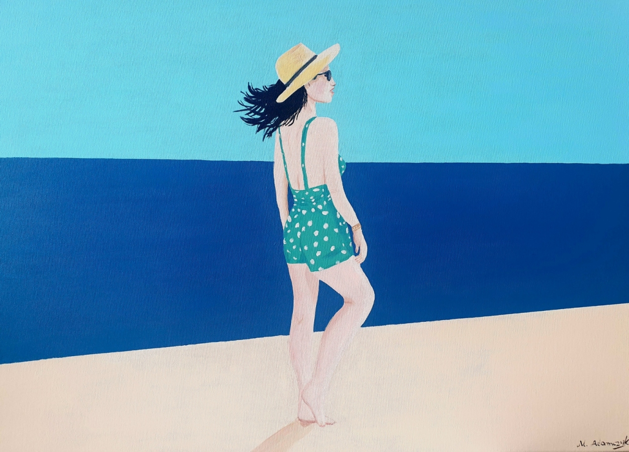 Na obrazie widzimy kobietę stojącą nad morzem, wpatrzoną w horyzont. Dominują tu spokojne, pastelowe kolory: błękit nieba, głębia granatowego morza i delikatny piasek pod stopami. Kobieta nosi zielony strój w białe groszki, a jej kapelusz rzuca cień na twarz, tworząc intrygujący kontrast. Kompozycja jest prosta, lecz przemyślana, z wyraźnym podziałem na kolorowe strefy, co nadaje obrazowi harmonii i spokoju. Nastrój jest beztroski, letni, a może nawet nieco nostalgiczny. Artysta posługuje się płaskimi plamami barw, co nadaje dziełu styl minimalistyczny, a zarazem nowoczesny. Technika akryli sprawia, że kolory są intensywne i żywe, przykuwając uwagę odbiorcy. Obraz może wywoływać marzenia o wakacjach i chwilach wytchnienia na plaży. Obraz ten przyciąga swoją prostotą i subtelnością. Zaskakuje i uspokaja. Idealny, by zatrzymać się na moment w codziennym pędzie.