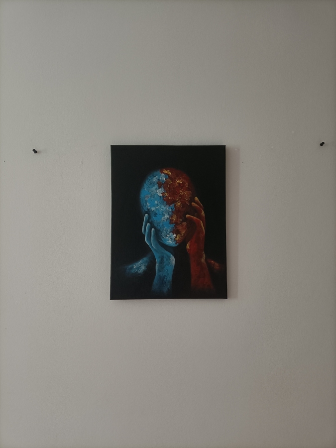 Obraz "You need to decide II" powstał w 2024r. Portret podzielonej na pół postaci ukazuje jej dualizm. Klasycznie przeciwstawne kolory tworzące postać pięknie wybijają się na czarnym tle.