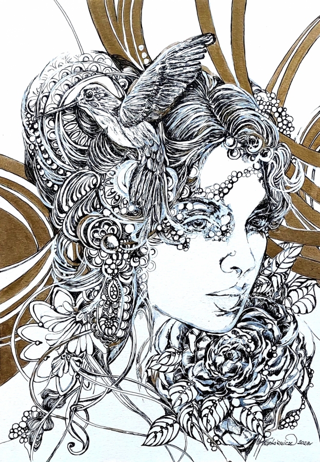 Obraz z cyklu ,, Grafik bez tytułu ,, poz.1 - nostalgiczny rysunek , wykonany tradycyjną techniką tuszu na profesjonalnym , białym papierze artystycznym .. Rysunki w stylu dekoracyjnego realizmu. Sztuka kobieca z nutą złotej secesji . Wysoka jakość zastosowanych podczas tworzenia materiałów artystycznych , oraz naturalna kolorystyka podbijają walory artystyczne pracy. Tusze artystyczne koloru czarnego, złota i bieli . Format rysunku 29,7 x 42 cm ./A3/ Zabezpieczony werniksem. Praca oryginalna , jedyny egzemplarz opatrzony Autorskim Certyfikatem Autentyczności. Sygnatury autorskie umieszczone z przodu i z tyłu pracy. ,,,,,,,,,,,,,,,,,,,,,,,,,, Art by Jolanta Frankiewicz ,,,,,,,,,,,,,,,,,,,,,,,,,,,,,