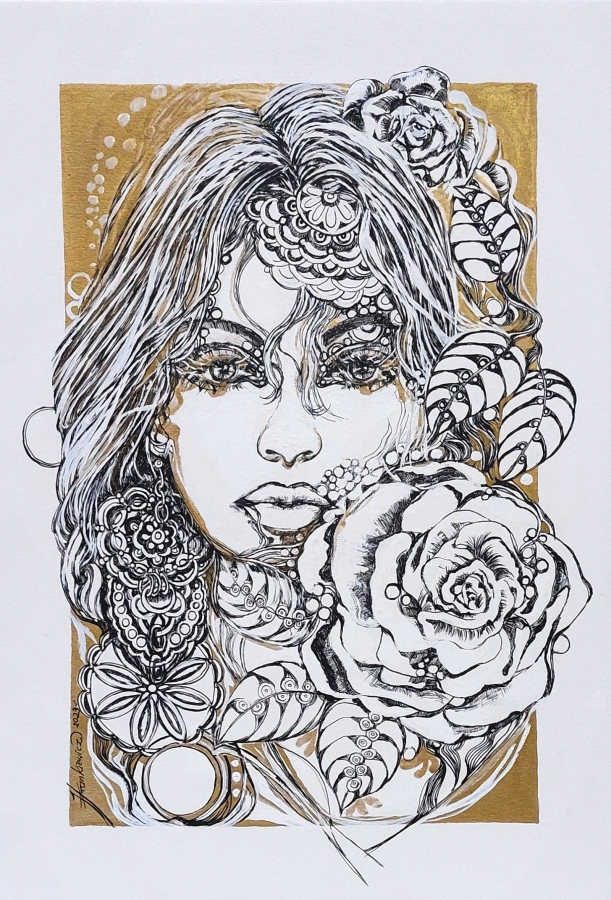 Obraz z cyklu ,, Grafik bez tytułu ,, poz,7 Złoto otula ciepłem kobiecą twarz . Jej spojrzenie przyciąga uwagę jak magnes . Czarne linie jak meandry wiją się , tworząc wir roślinnych kształtów. Artystka mistrzowsko połączyła szczegółowość w rysowanych elementach z prostotą tła. Wydaje się , że postać wychyla się ku widzowi. Cała kompozycja pulsuje tajemną energią. Kolory są stonowane , co pozwala skupić się na detalach. Rysunki zatrzymują oddech. Czuć tajemnicę i elegancję , które mogą obudzić fascynację i zachwyt. Obraz otwiera wrota do innego świata , pełnego fantazji, wizji, i niezwykłych historii. Grafika wykonana w technice piórko i tusz na papierze o grubości 600 g/m2 . Format grafiki 29,7 x 42 cm ./A3/. Sygnatury autorskie umieszczone z przodu i z tyłu obrazu. Tusze koloru czarnego i złota . ------------Art by Jolanta Frankiewicz-----------
