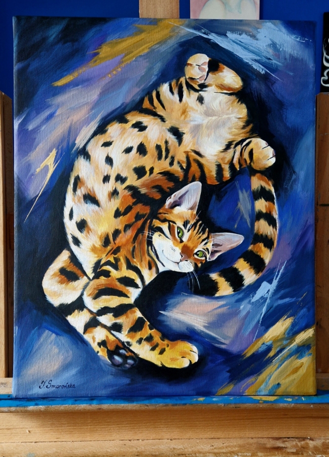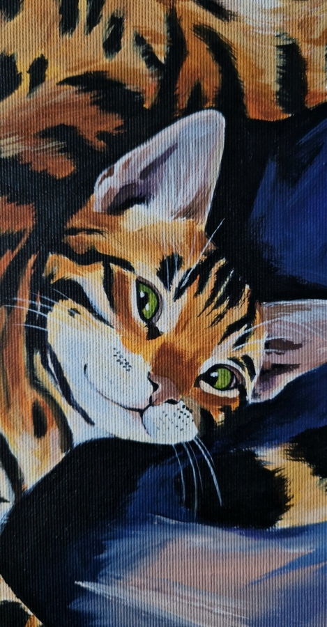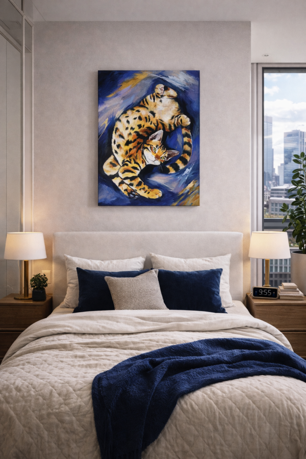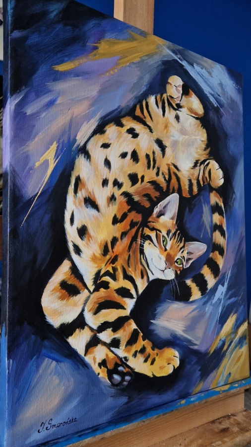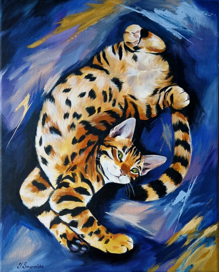 W tym obrazie widać całą istotę kotów. Dynamiczny portret rudego kota uchwyconego w ruchu – pełnego energii, pewności siebie i nieco przekornej elegancji. Intensywne, kontrastujące barwy – głęboki granat i kobalt zestawione z ciepłymi odcieniami pomarańczu – tworzą wrażenie wirującej przestrzeni, w której bohater obrazu zdaje się tańczyć. Hipnotyzujące, zielone spojrzenie przyciąga uwagę i nadaje kompozycji charakteru.
