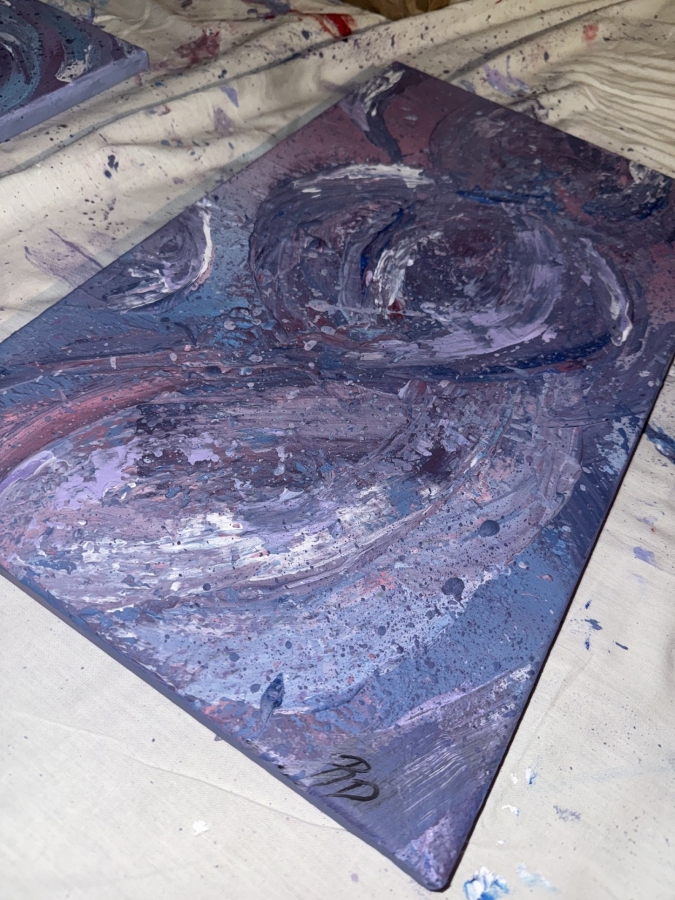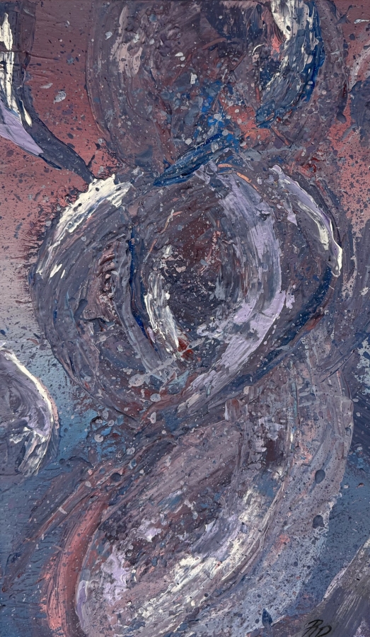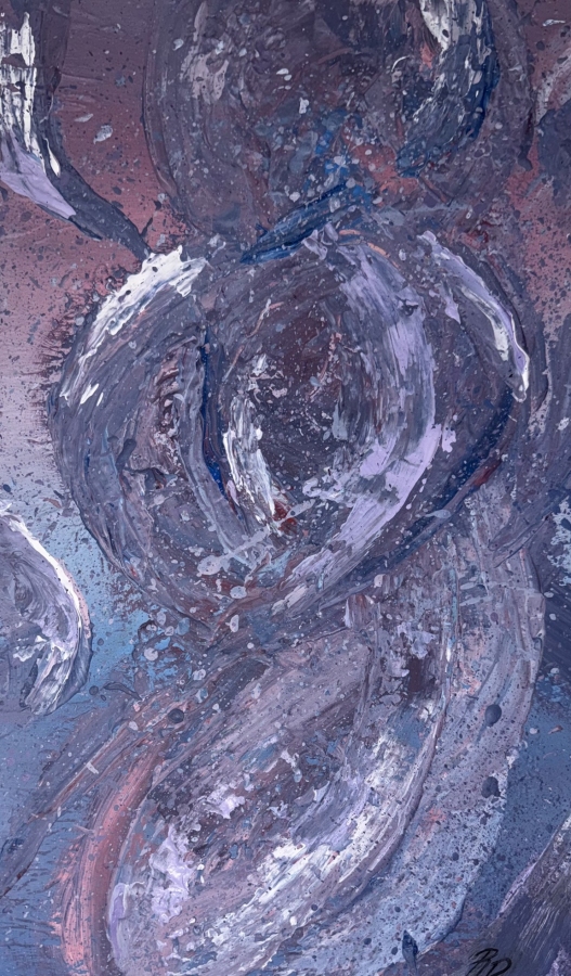 Ten obraz oddaje energię zimowej zamieci tuż przed nadejściem nocy. Dynamiczne, szerokie pociągnięcia pędzla tworzą wirujące struktury przypominające unoszący się w powietrzu śnieg. Chłodne tony fioletu i niebieskiego przeplatają się z delikatnymi akcentami jasnego różu, budując napięcie między ruchem a wyciszeniem. To praca pełna życia, która przyciąga wzrok swoją głębią i atmosferą zimowego żywiołu.