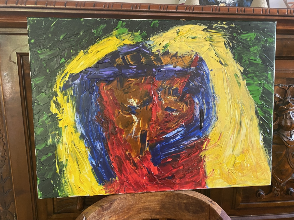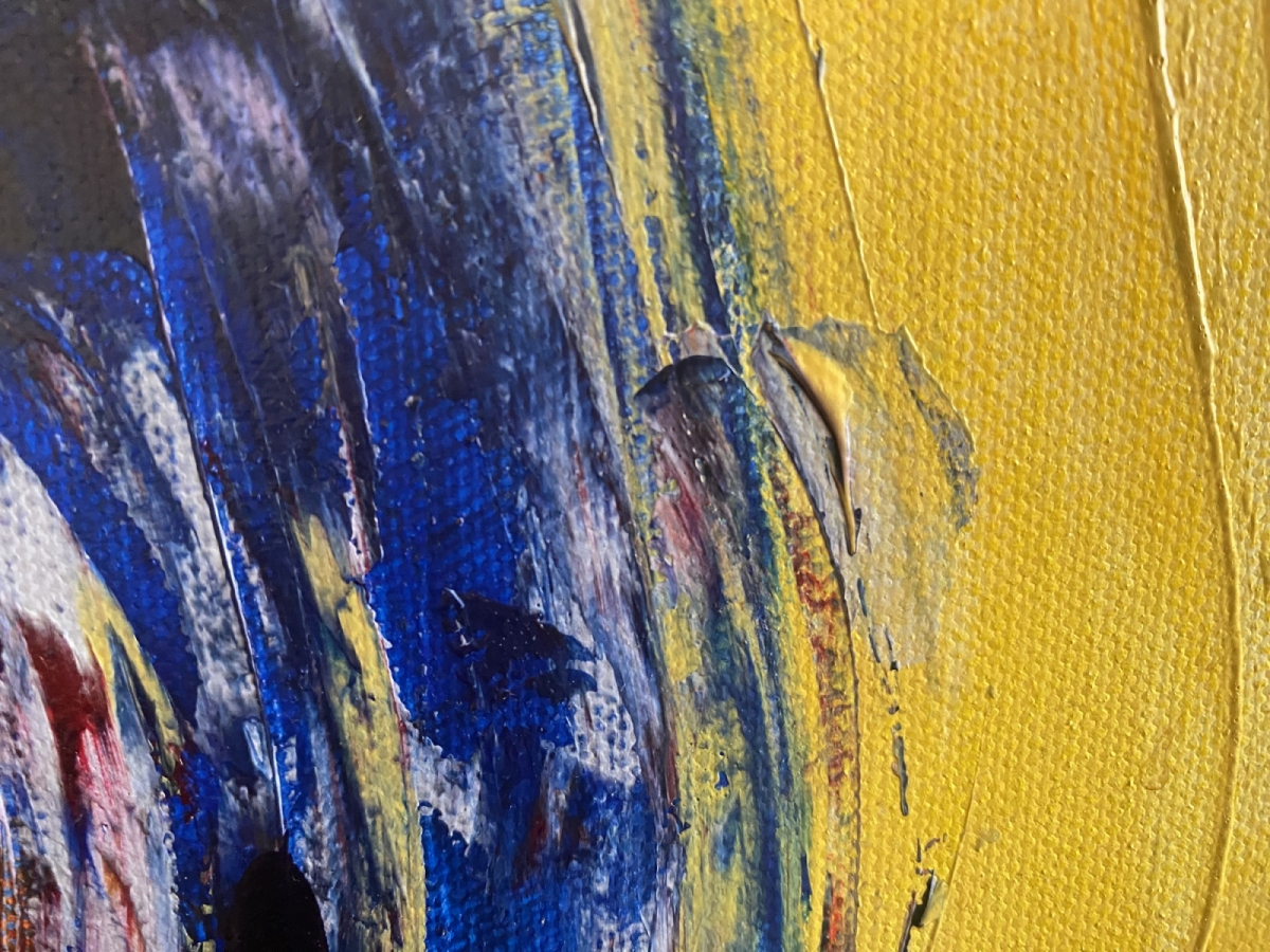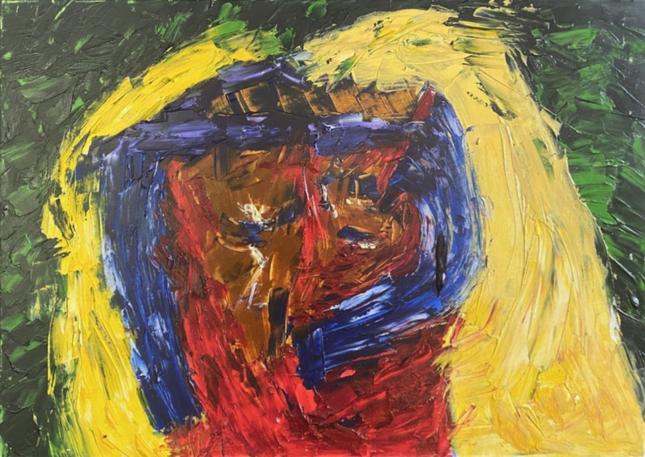 Twarz wyłania się z wiru koloru: ochry, kobalty, zielenie. Ekspresyjny gest i impasty niosą emocję – smutek, bunt, przebłysk nadziei. To praca, która przyciąga rozmowy i skupia wzrok od progu.