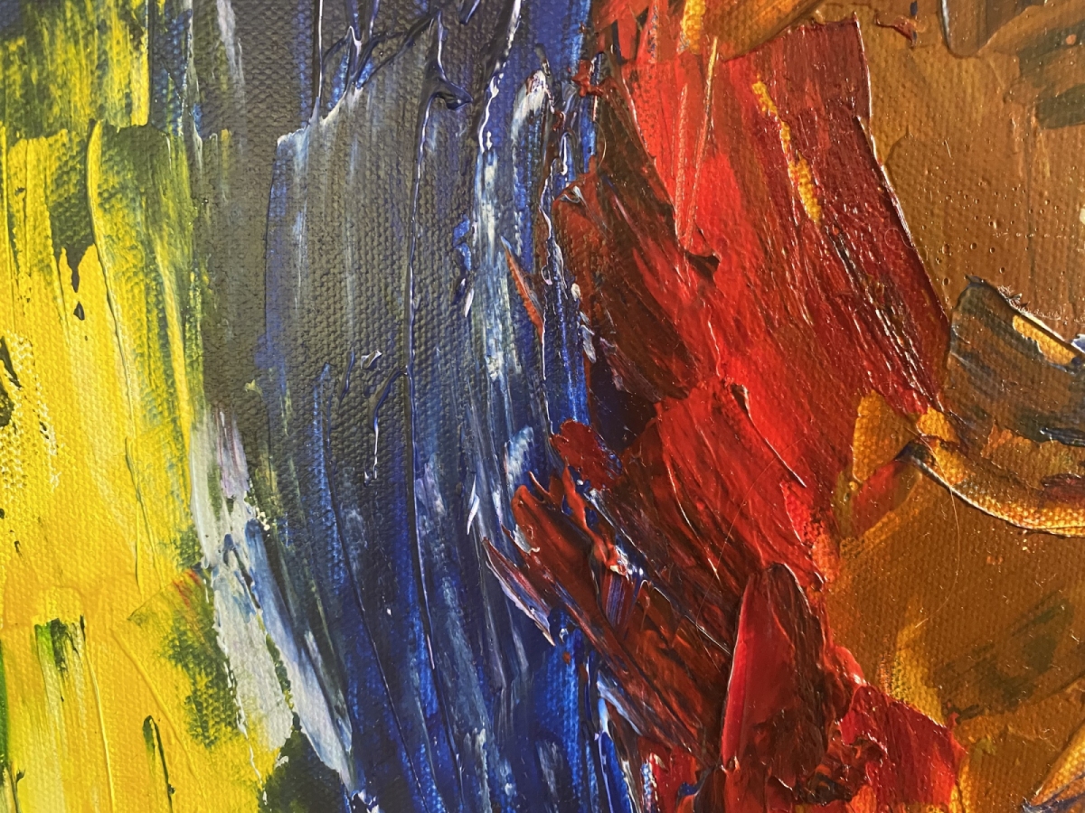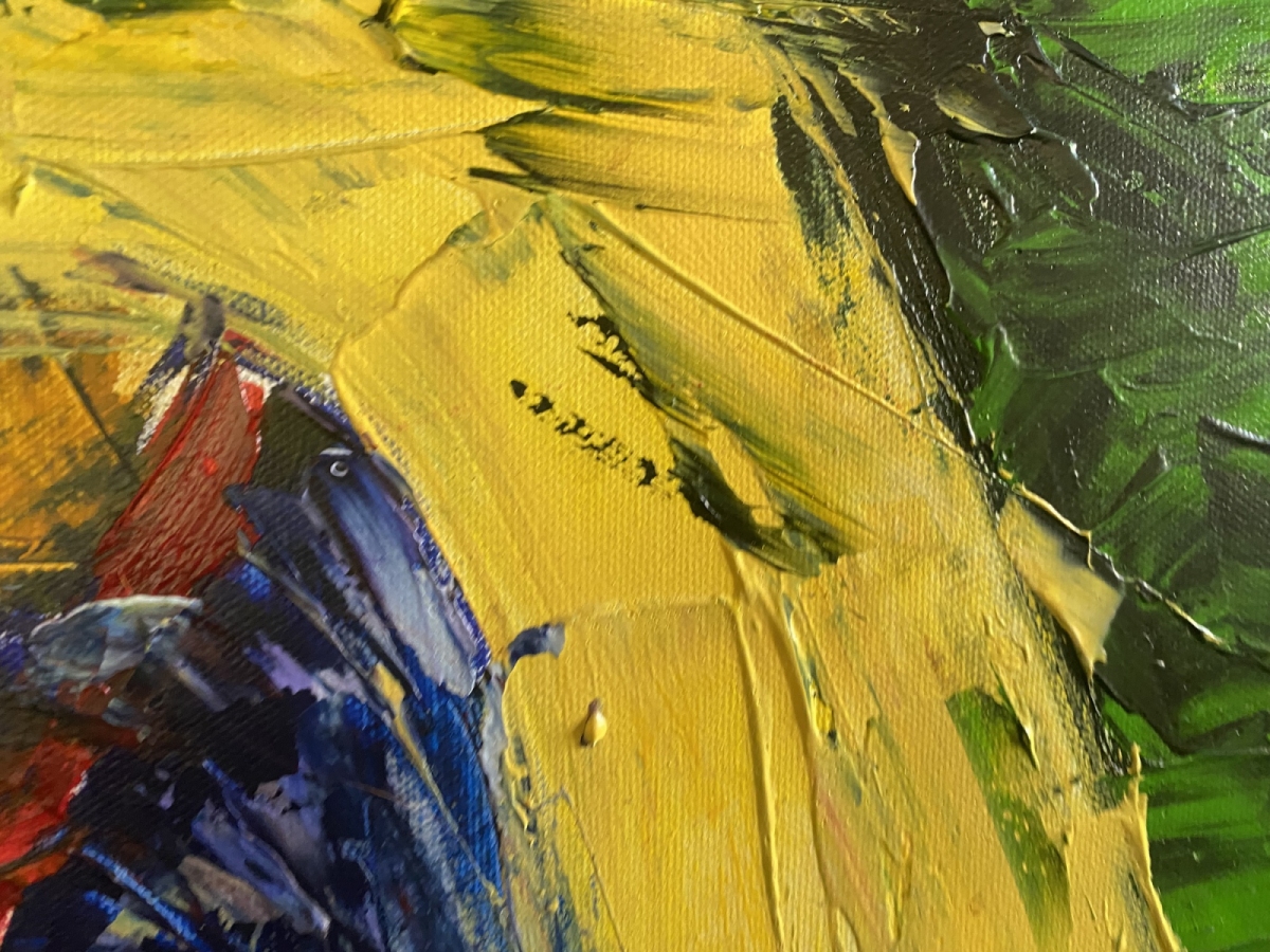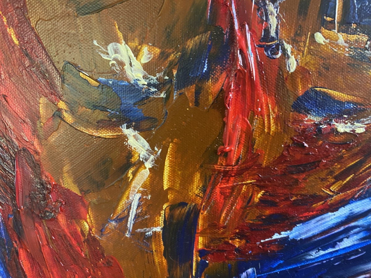Twarz wyłania się z wiru koloru: ochry, kobalty, zielenie. Ekspresyjny gest i impasty niosą emocję – smutek, bunt, przebłysk nadziei. To praca, która przyciąga rozmowy i skupia wzrok od progu.