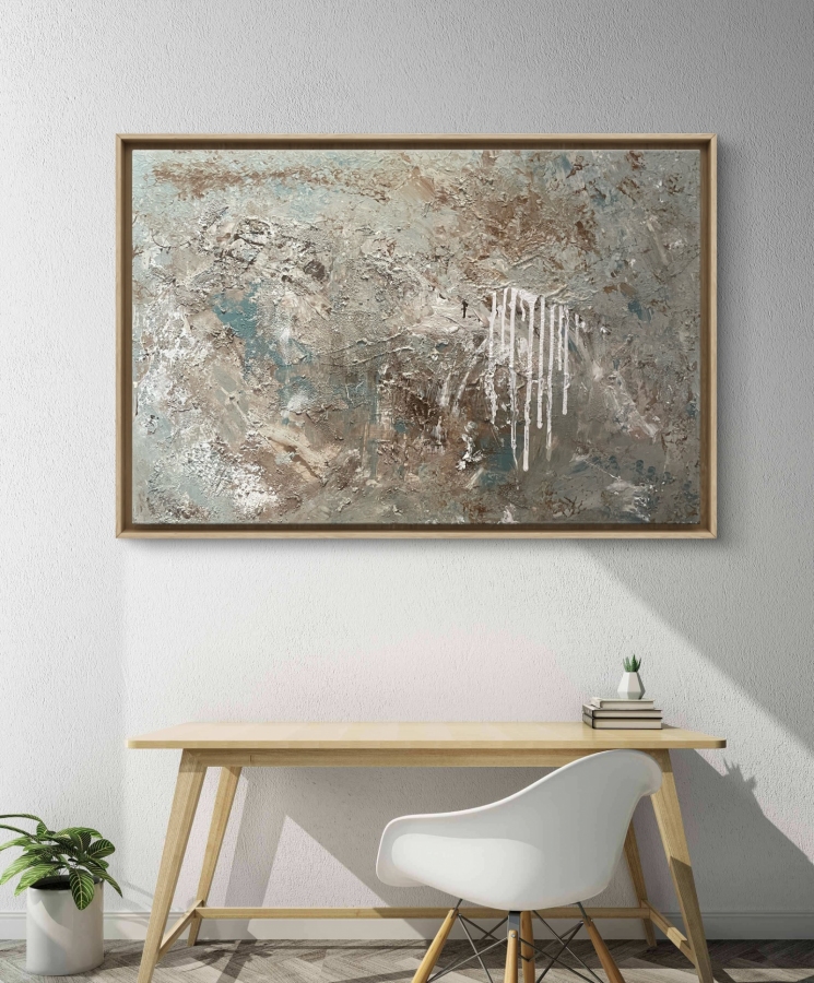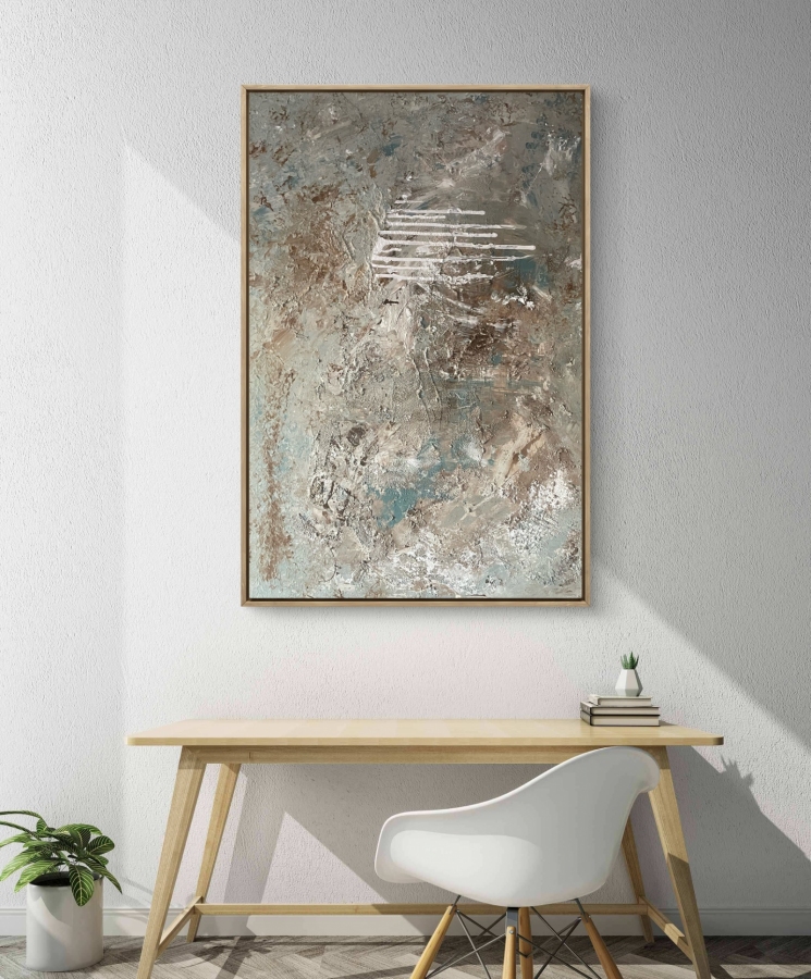 Akryl, struktura, zabezpieczony werniksem, podobrazie 80x120 Obraz abstrakcyjny, strukturalny w ziemistych barwach, który odnajdzie się w stylu soft minimalizm, japandi lub innych stonowanych wnętrzach ale i nie tylko. Struktura przyciąga wzrokiem, a obraz nie tylko da się widzieć ale i „słyszeć” jak zew, wołanie duszy i oddech przestrzeni. Filmik ze szczegółami dostępny na instagramie - b.art.ek.chmielak Oferta nie zawiera ramy. Możliwe oprawienie - 300zl w ramę typu american box
