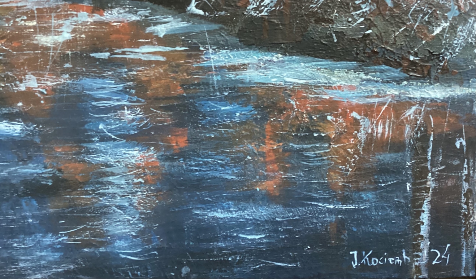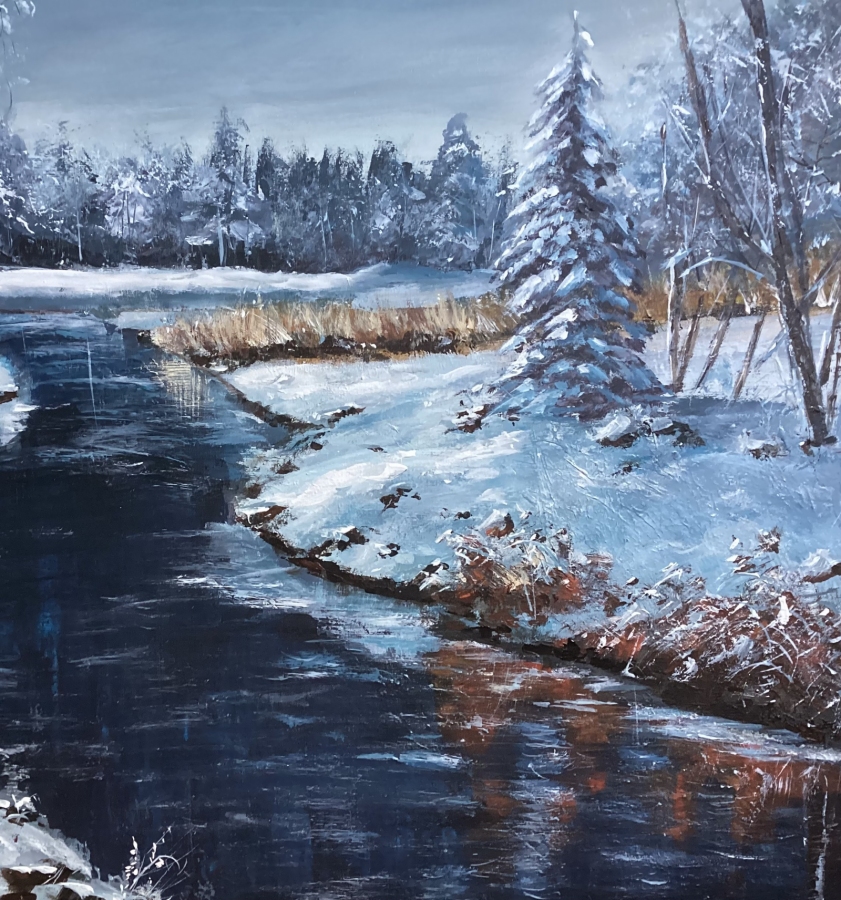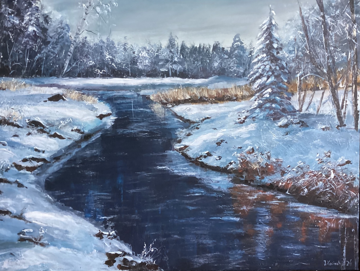 „Zima w Dolinie Baryczy” to obraz kontemplacji i wyciszenia. Rozległe, zaśnieżone pola otwierają przestrzeń, w której wijąca się rzeka wprowadza delikatny rytm życia, a drzewa obciążone śniegiem zdają się trwać w bezruchu. Cisza bijąca z tego miejsca nie jest pustką — to pełnia spokoju, która pozwala zatrzymać czas i doświadczyć natury w jej najbardziej ascetycznej, a zarazem poetyckiej formie. Obraz namalowany aktywami na płóciennym blejtramie, całość zabezpieczeniowa werniksem satynowym, boki są kontynuacją obrazu.
