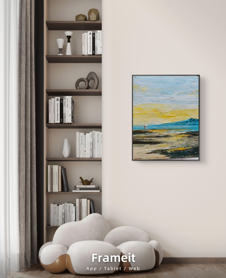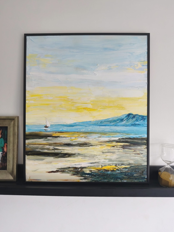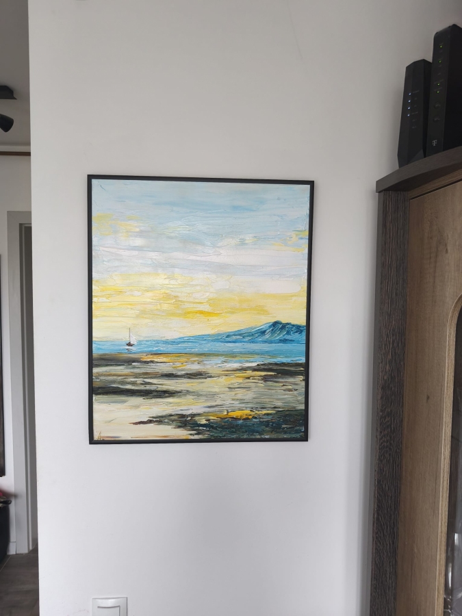 Obraz namalowany na płycie malarskiej, szpachlą, farbami olejnymi. W stylu impasto - grube nałożenie farby, co dodaje faktury i impresji. Obraz posiada cienką czarną ramkę aluminiową.