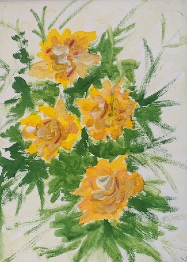 Obraz pt. Żółte kwiaty w zielonych liściach" przedstawia cztery duże, żółte kwiaty otoczone soczyście zielonymi liśćmi. Płatki są namalowane wyraźnymi, energicznymi pociągnięciami pędzla, które dodają faktury i głębi. Kwiaty są ułożone ukośnie na płótnie, tworząc wrażenie ruchu. Tło jest jasne i neutralne, co sprawia, że jaskrawe kolory są wyraźniejsze. Zielone liście rozchodzą się w różnych kierunkach, nadając kompozycji naturalny, a zarazem lekko dziki wygląd. Kontrast między żółcią a zielenią tworzy świeżą i żywą atmosferę. Ogólny nastrój obrazu jest radosny, ciepły i pełen życia.