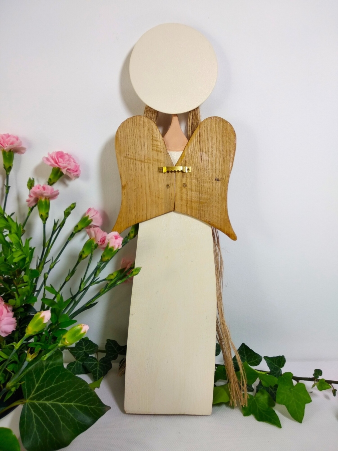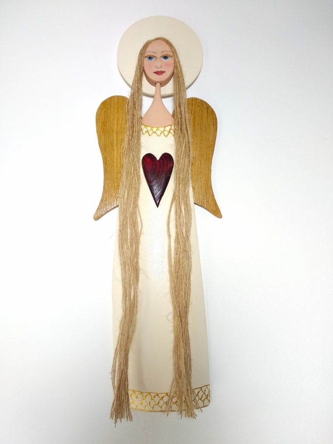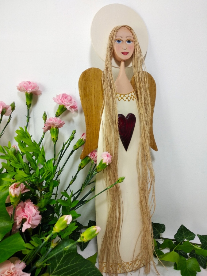 Ręcznie wykonany z drewna, utrzymany w jasnych, kremowo-złotych tonacjach z ciepłymi, w naturalnej barwie skrzydłami. Na piersi nosi ciemnoczerwone serce – symbol miłości, którą się dzieli, a nie zatrzymuje dla siebie. Długie włosy z naturalnego sznurka i subtelny uśmiech dodają mu łagodności i kobiecego ciepła. „Czułość” wnosi spokój i światło tam, gdzie jest miejsce na bliskość – idealny do sypialni, na prezent lub jako codzienne przypomnienie o delikatnej sile dobra. Wymiary: wysokość 46 cm, szerokość skrzydeł 15 cm.