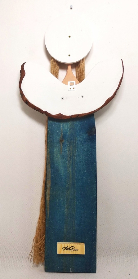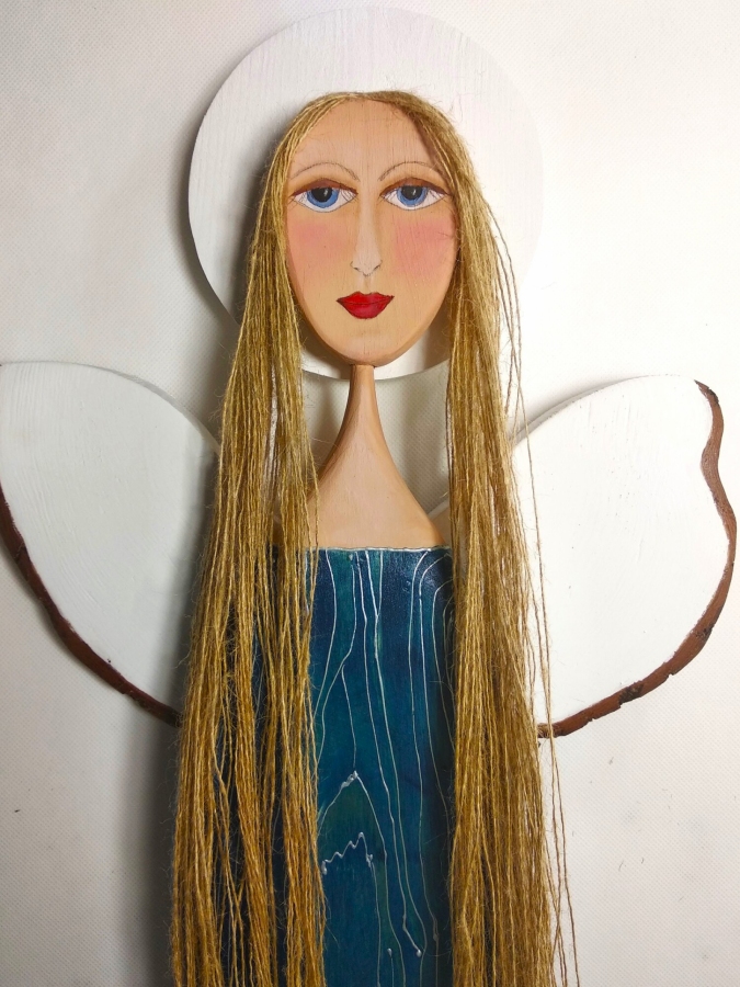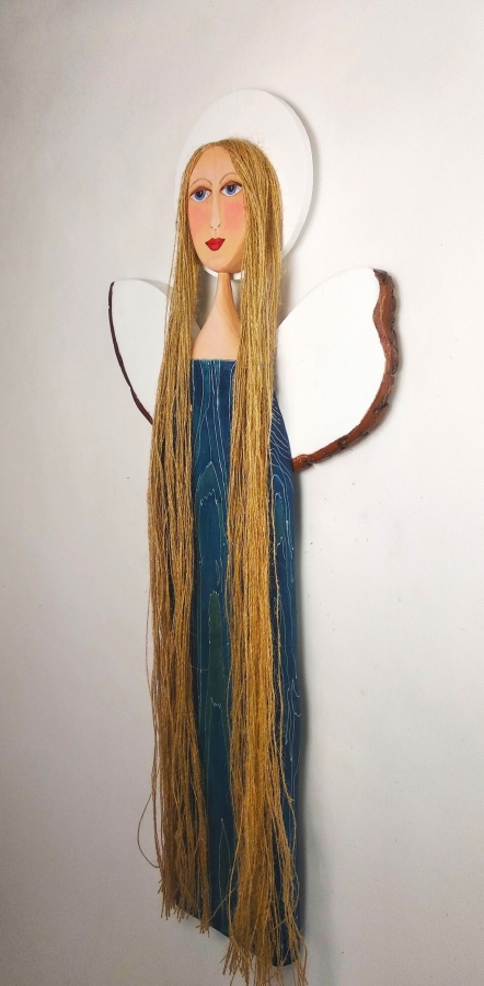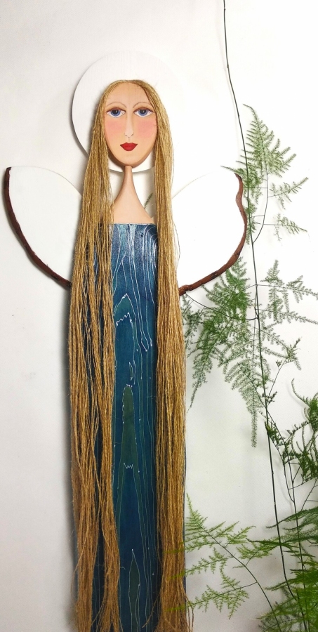 Anioł ręcznie wykonany z drewna sosnowego. Sukienka barwiona bejcą wodną, zabezpieczona satynowym lakierem akrylowym i ozdobiona srebrną aplikacją podkreślającą słoje drewna. Aureola i skrzydła malowane białą akrylową farbą. Anioł ten może być prezentem dla kogoś bliskiego na wszelkie okazje. Swoją obecnością wniesie wiele pozytywnej energii. Wymiary: wysokość 74 cm, szerokość skrzydeł 30 cm. Uwaga - ze względu na wymiar przekraczający możliwości paczkomatów, anioł może być wysłany tylko za pośrednictwem kuriera.