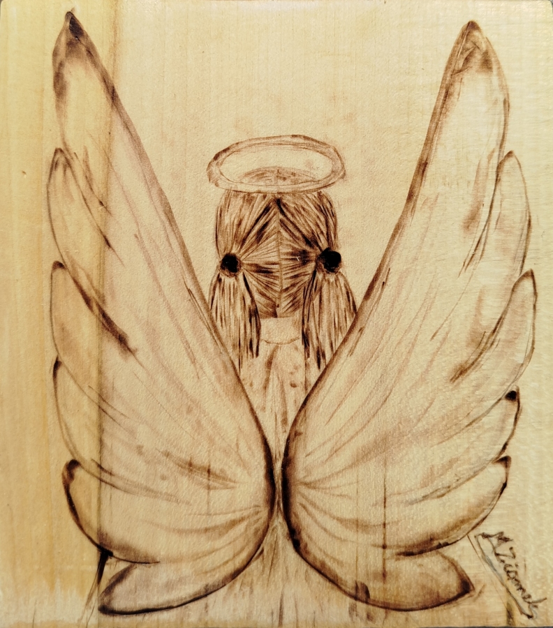Wypał na desce lipowej przedstawiający Anioła Stróża, zabezpieczony lakierem najwyższej jakości. Idealny pomysł na prezent dla bliskiej osoby ceniącej wyjątkowe upominki.