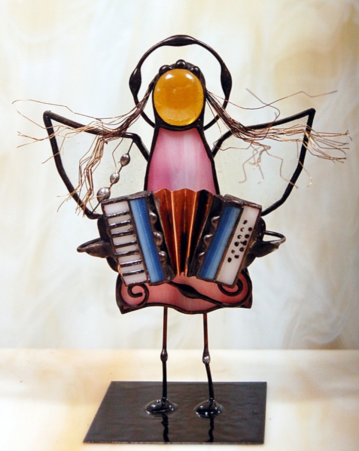 Aniołek witrażowy wykonany z wysokiej jakości szkła witrażowego spectrum (USA) i metali kolorowych (miedź, mosiądz, cyna). Wykonanie technika Tiffany. Patynowany na czarno. Wysokość aniołka 13 cm, podstawka 6 x 6 cm. Możliwy wybór różnej kolorystyki przez kupującego.