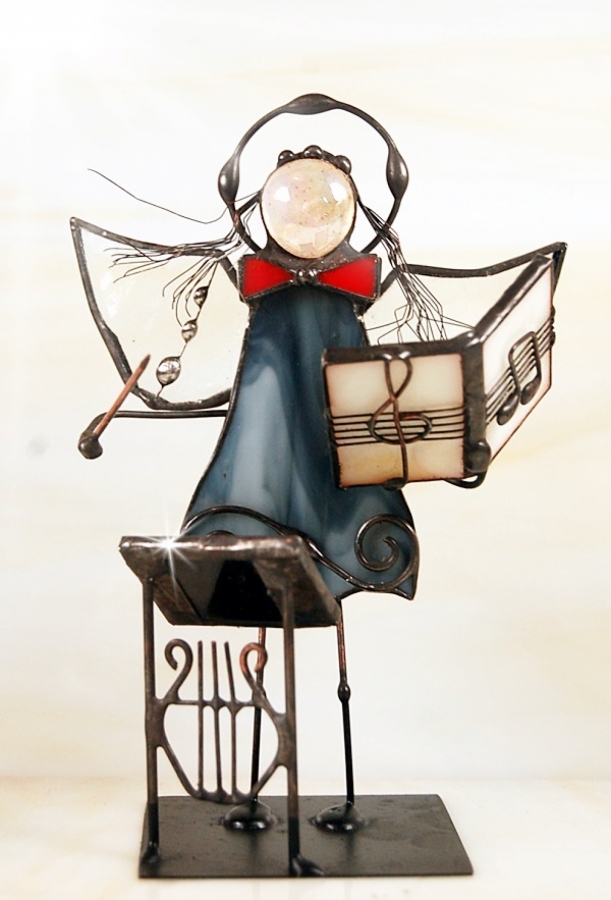 Aniołek witrażowy dyrygent wykonany z wysokiej jakości szkła witrażowego spectrum (USA) i metali kolorowych (miedź, mosiądz, cyna). Wykonanie technika Tiffany. Patynowany na czarno. Wysokość aniołka 13 cm, podstawka 6 x 6 cm. Możliwa wersja męska (na zdjęciu) lub damska (z włosami). Można wybrać aniołka w dowolnym kolorze.