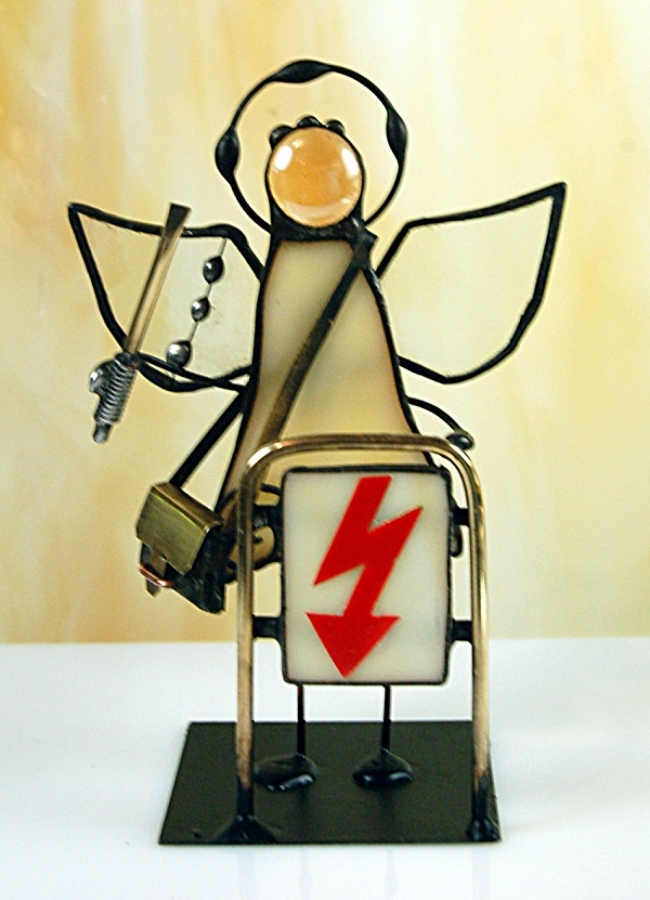 Aniołek witrażowy elektryk wykonany z wysokiej jakości szkła witrażowego spectrum (USA) i metali kolorowych (miedź, mosiądz, cyna). Wykonanie technika Tiffany. Patynowany na czarno. Wysokość aniołka 13 cm, podstawka 6 x 6 cm. Możliwy wybór różnej kolorystyki przez kupującego.