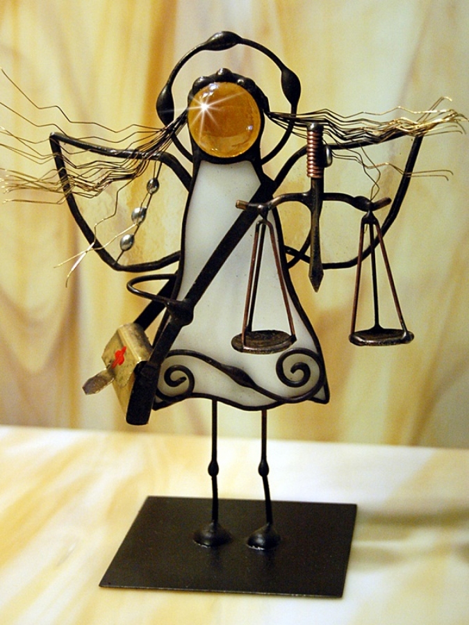 Aniołek witrażowy farmaceutka wykonany z wysokiej jakości szkła witrażowego spectrum (USA) i metali kolorowych (miedź, mosiądz, cyna). Wykonanie technika Tiffany. Patynowany na czarno. Wysokość aniołka 13 cm, podstawka 6 x 6 cm. Możliwa wersja męska (na zdjęciu) lub damska (z włosami). Można wybrać aniołka w dowolnym kolorze. Obejrzyj inne prace.