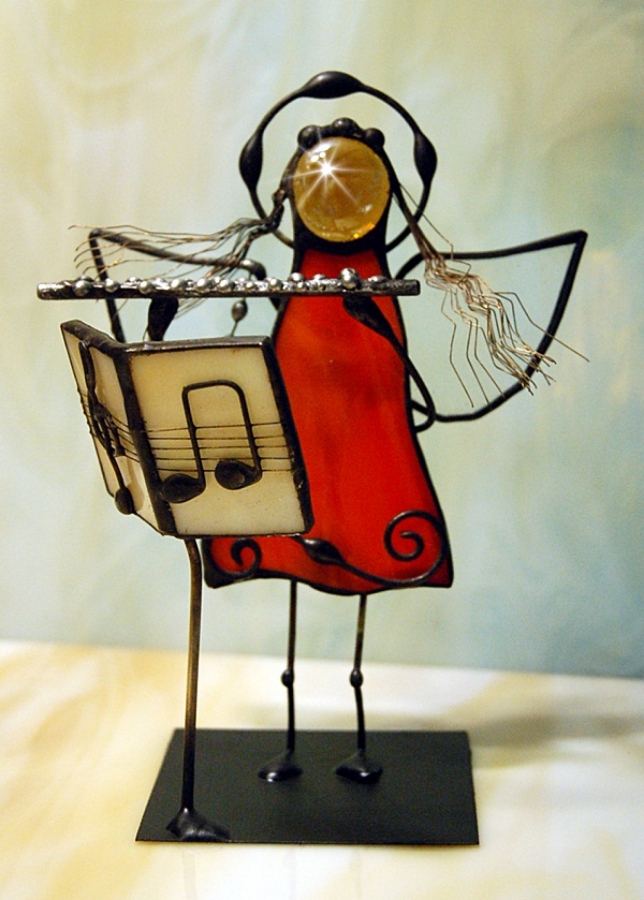 Aniołek witrażowy flecistka wykonany z wysokiej jakości szkła witrażowego spectrum (USA) i metali kolorowych (miedź, mosiądz, cyna). Wykonanie technika Tiffany. Patynowany na czarno. Wysokość aniołka 13 cm, podstawka 6 x 6 cm. Możliwy wybór różnej kolorystyki przez kupującego.