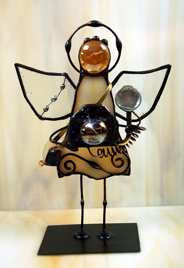 Aniołek witrażowy fotograf wykonany z wysokiej jakości szkła witrażowego spectrum (USA) i metali kolorowych (miedź, mosiądz, cyna). Wykonanie technika Tiffany. Patynowany na czarno. Wysokość aniołka 13 cm, podstawka 6 x 6 cm. Możliwy wybór różnej kolorystyki przez kupującego.