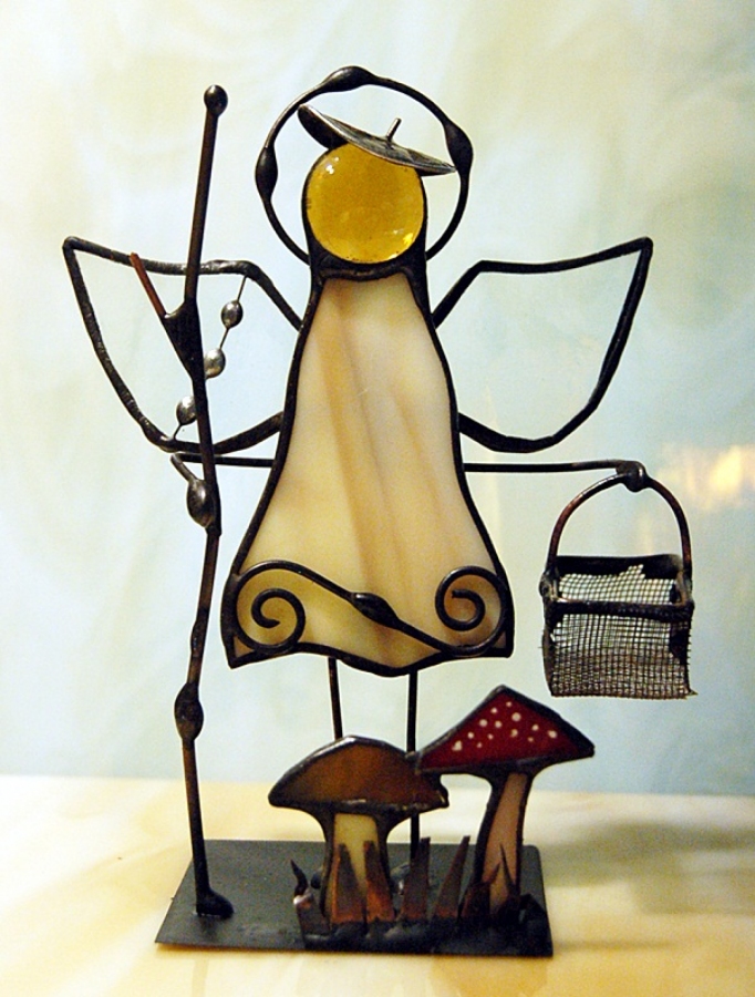 Aniołek witrażowy grzybiarz wykonany z wysokiej jakości szkła witrażowego spectrum (USA) i metali kolorowych (miedź, mosiądz, cyna). Wykonanie technika Tiffany. Patynowany na czarno. Wysokość aniołka 13 cm, podstawka 6 x 6 cm. Możliwy wybór różnej kolorystyki przez kupującego.