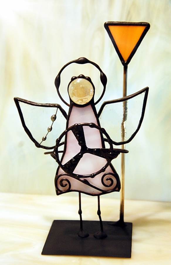 Aniołek witrażowy kierowca wykonany z wysokiej jakości szkła witrażowego spectrum (USA) i metali kolorowych (miedź, mosiądz, cyna). Wykonanie technika Tiffany. Patynowany na czarno. Wysokość aniołka 13 cm, podstawka 6 x 6 cm. Znak drogowy ma wysokość 18 cm. Możliwa wersja męska (na zdjęciu) lub damska (z włosami). Można wybrać aniołka w dowolnym kolorze.
